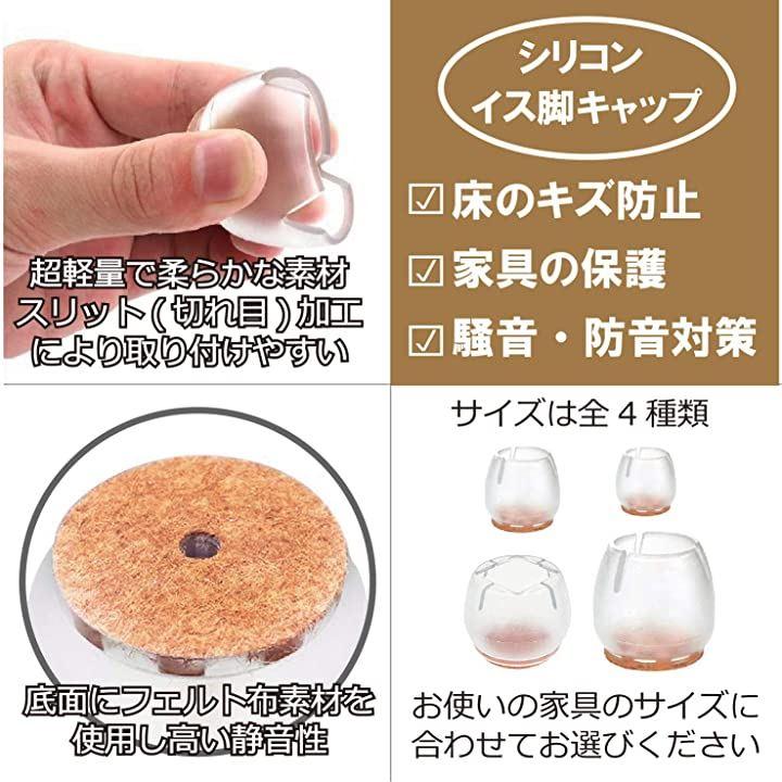伸縮性のあるシリコンキャップで取付が簡単。柔らかい素材で椅子やテーブル等の脚に装着できます。