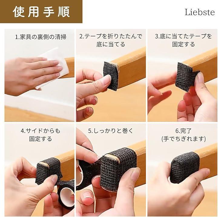 巻き付けタイプの自着性テープを使用しており、取り付けが簡単で、家具に痕跡を残すことなく、繰り返し使用が可能です。