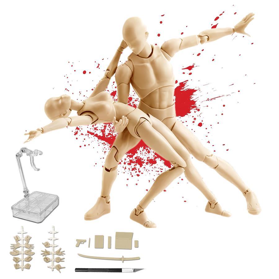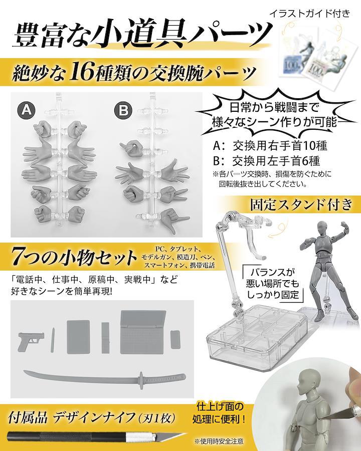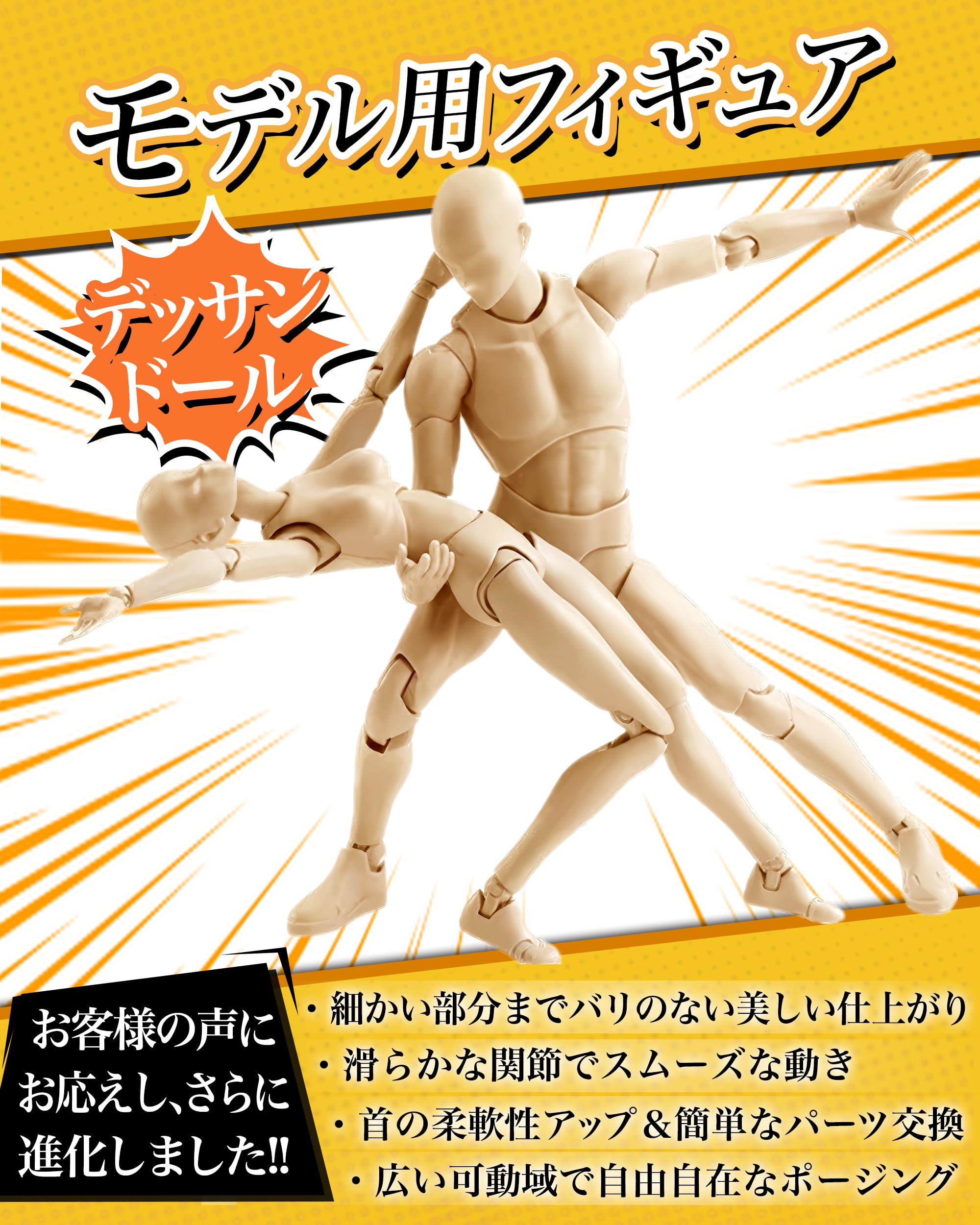 ?【改良版!30個関節が可動】ご要望の多いリクエスト(バリが目立つ、関節がゆるゆる、パーツの交換が難しい、硬くて動かしにくい)にすべてお応えました!!ヘッド、胸、腰、肩、肘、手首、膝、足首など全身の30ヵ所以上が可動し、自由自在に手足を曲げる事ができる、目的のポーズやアクションが簡単に再現、様々な角度から観察してデッサンすることが可能。人形の関節は可動式なので、好きな姿勢に変形でき、人体の姿勢を研究するのに役立ちます。 ?【人間に近い骨格と筋肉を再現】高品質のPVC製ですので手触りも良く、はっきりと筋肉や骨格の流れがわかります。人間に近い男女別の骨格と筋肉の張りを忠実に再現!走る、歩く、ジャンプなどの線画を描く際に輪郭を描きやすいフィギュアとなります。アート/撮影/インテリアなどの場合に活躍できます。 ?【好きなポーズで撮影】色々なポーズをカメラで撮影して、後からじっくり描くことが可能です。固定スタンド付きで、バランスが悪くてもよく立てられます。各ポーズを再現することができ、色んな角度から観察することも可能です。イラストや写真の構図、デッサンやデザイン、フィギュアがお絵描き、漫画の練習などにオススメです。 ?【男性版・女性版の内容物】材質:PVC 本体、交換用右手首10種、交換用左手首6種、ミニブック、PC、タブレット、ペン、スマートフォンなど、携帯電話、専用台座、ケース+手首ホルダー ※ケースは台座で蓋をすることができます。気軽にパーツを取り替えて好きなポーズを取らせることが可能。プロな描く練習として、人の各動きをもっと把握することができ、絵をより鮮やかにします。対象年齢:15歳以上 ?【沢山なシーンで活用できる】絵を描く際に使用するだけでなく、撮影、インテリア、服のデザインなどにもオススメです!