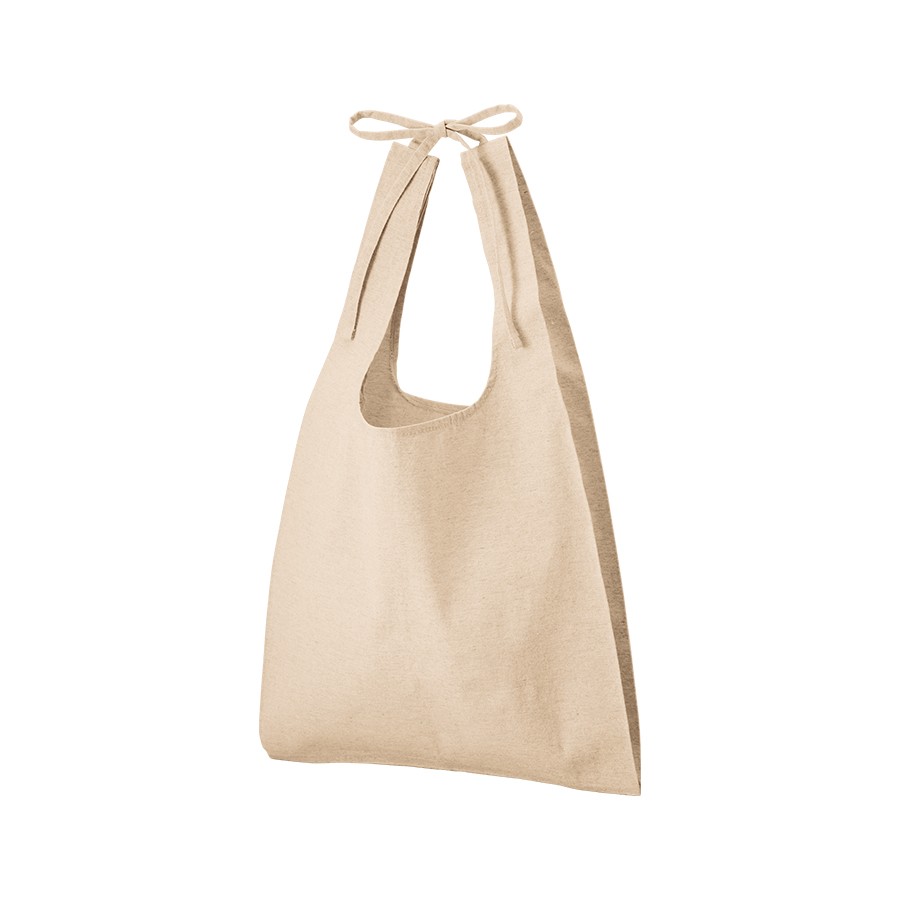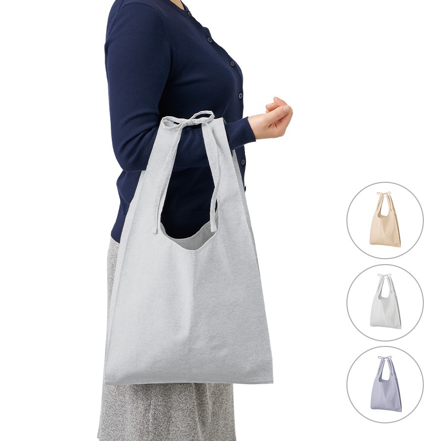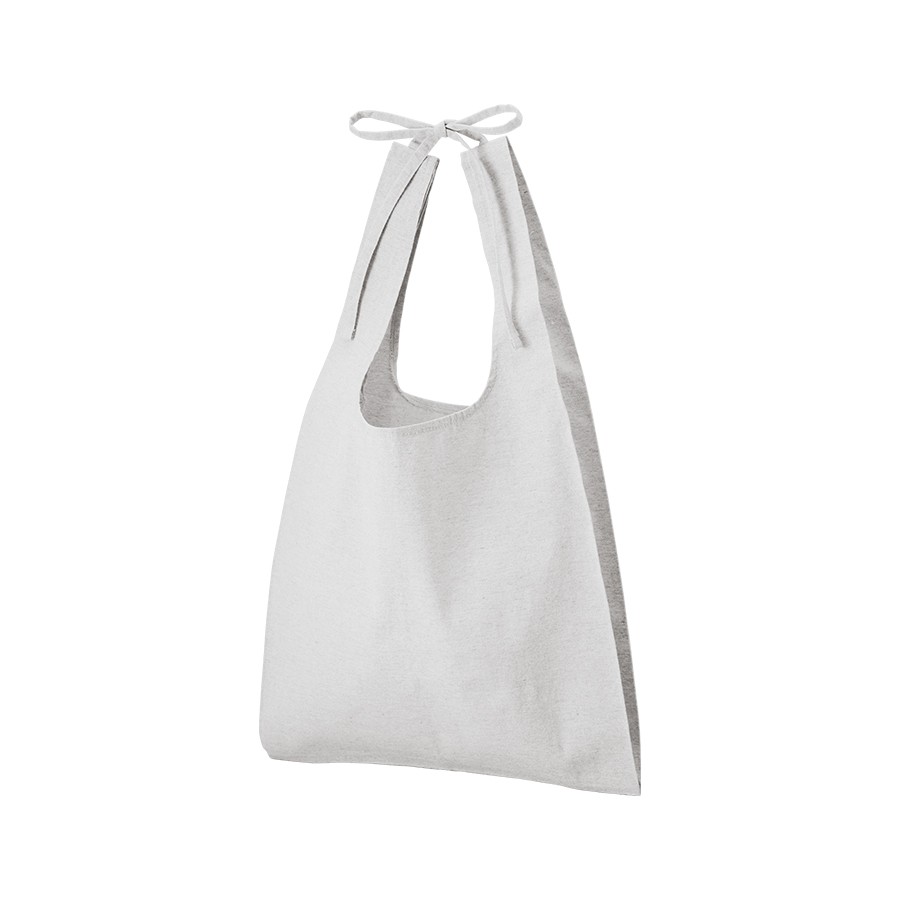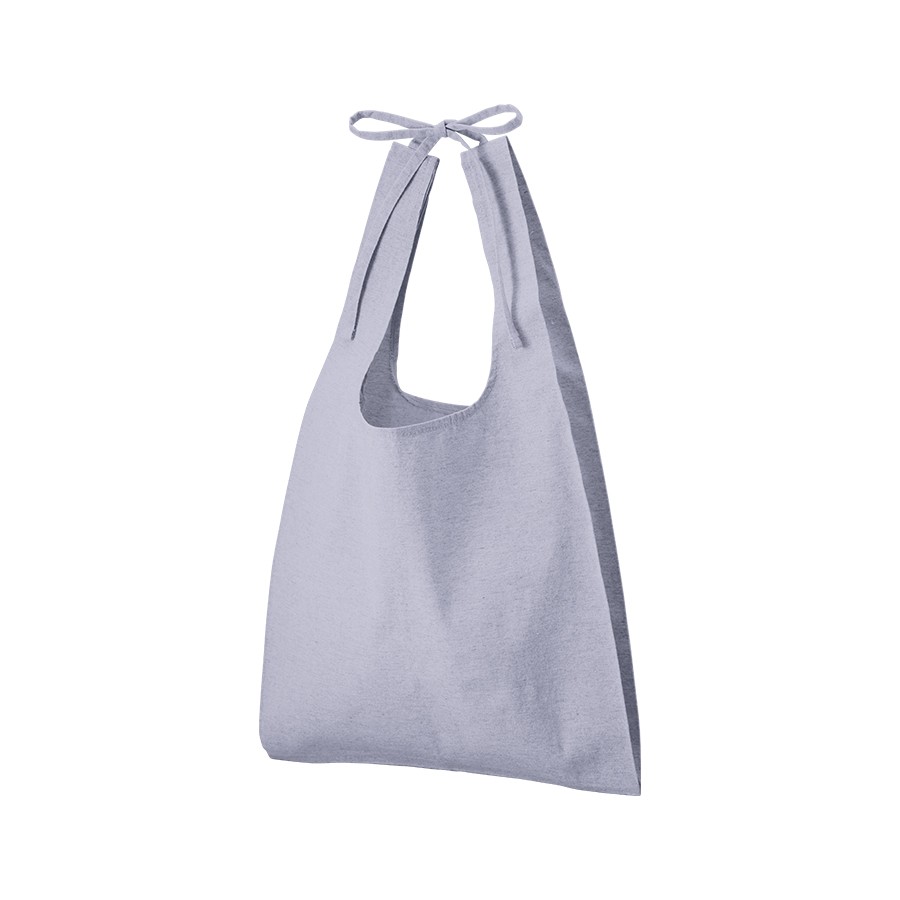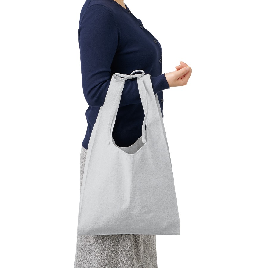 紐付きで便利な人気のマルシェ型バッグです。ハンドル部分についた紐の長さを調整することで、3パターンの使い方を楽しめます。紐を短めに結んで手持ちに、紐を長めに結べば肩掛け、ショルダーにと用途に合わせて変更できます。A4サイズが入るちょうど良いサイズ感で、荷物もしっかり入れていただけます。シャンブリック素材を使用した、グレー・ベージュ・サックスブルーのさわやかな3色展開です。フルカラー印刷対応なので、ノベルティとしてはもちろん、購入特典の限定ショッパーや物販品にもおすすめです。
