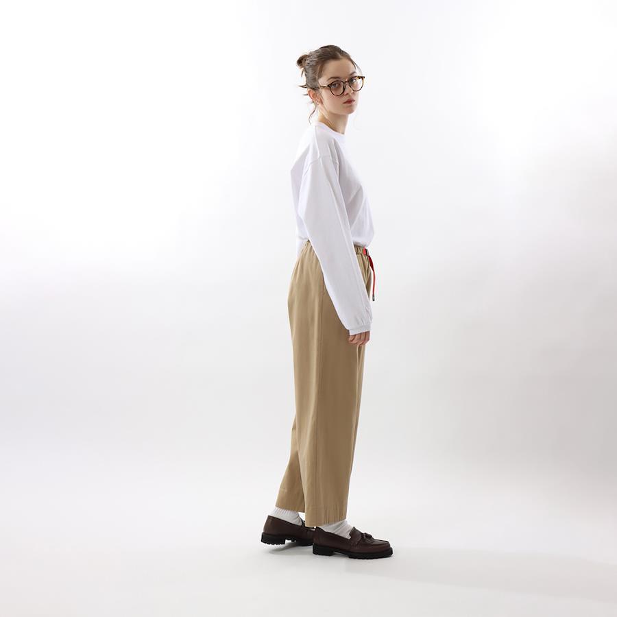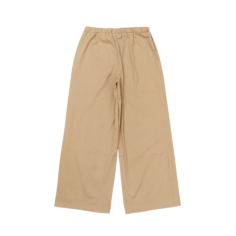 【DETAIL】・ストレッチ性のあるコットンツイルを使用したワイドパンツです。・ヒップ周りをすっきり見せるフルレングス丈。・ウエストのサイズはボディカラーごとに異なる色のグログランテープで調整が可能です。・テープの先端にはCロゴをプリントした別布を圧着で付けています。・両脇とヒップにポケット付き。・製品洗い加工による肌馴染みの良い快適な風合いと、洗濯後の縮みにくさもポイントです。