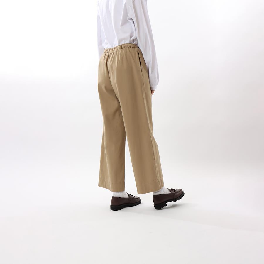 【DETAIL】・ストレッチ性のあるコットンツイルを使用したワイドパンツです。・ヒップ周りをすっきり見せるフルレングス丈。・ウエストのサイズはボディカラーごとに異なる色のグログランテープで調整が可能です。・テープの先端にはCロゴをプリントした別布を圧着で付けています。・両脇とヒップにポケット付き。・製品洗い加工による肌馴染みの良い快適な風合いと、洗濯後の縮みにくさもポイントです。