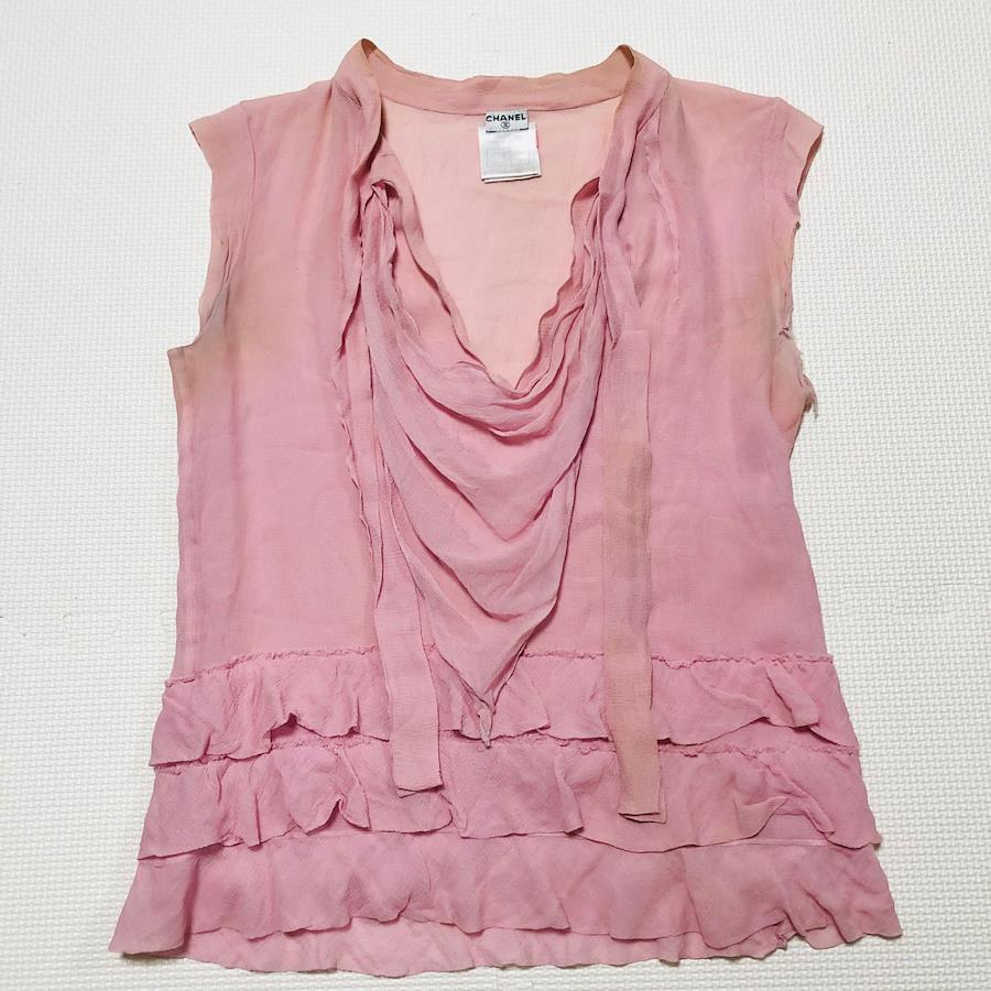 CHANEL 100% Silk Bowtie Blouse with French Sleeves and Layered Ruffle Hem, Size 36 (Size S), Made in France, Pink, Women's