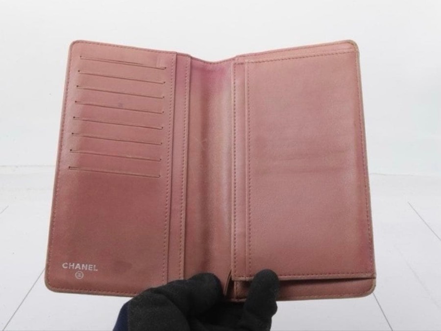 外側がブラックで内側がピンクのシャネル・カメリア長財布は、バイカラー仕様の人気モデルです。