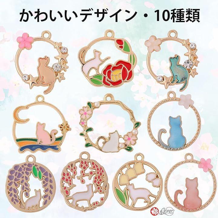愛くるしい猫ちゃんとお花をデザインしたジュエリーやアクセサリー作りに彩りと個性を加えるチャームパーツ10種40個セットです。