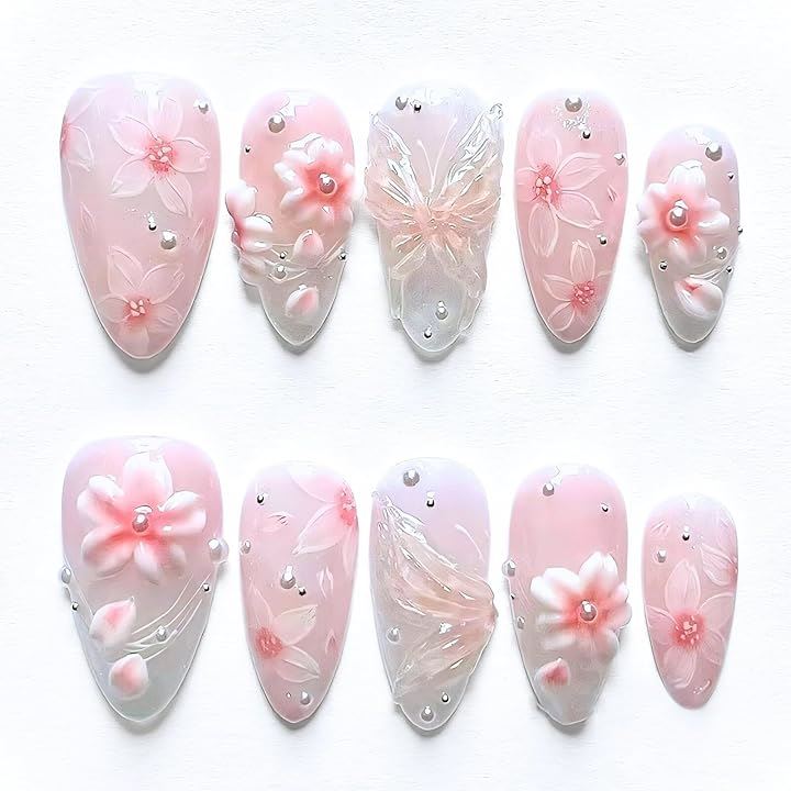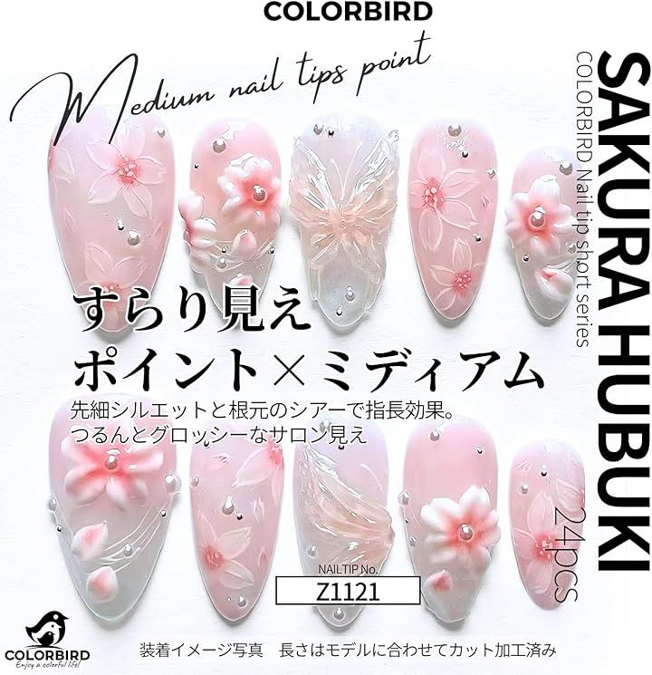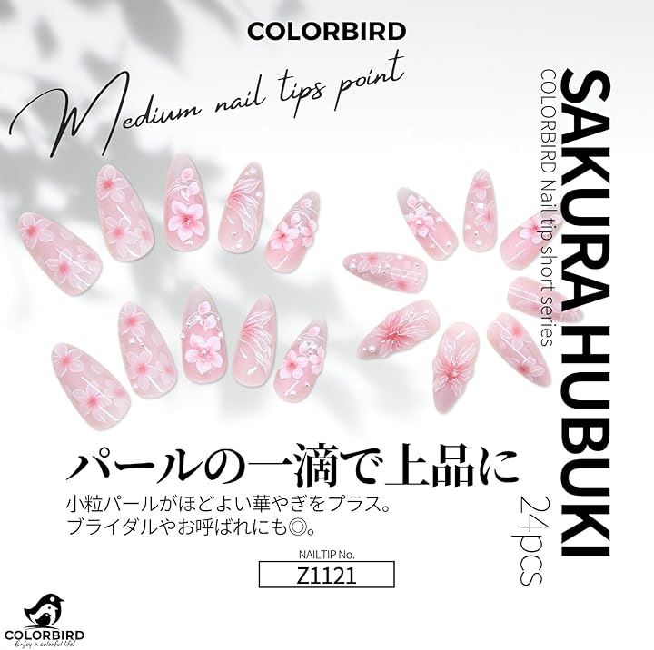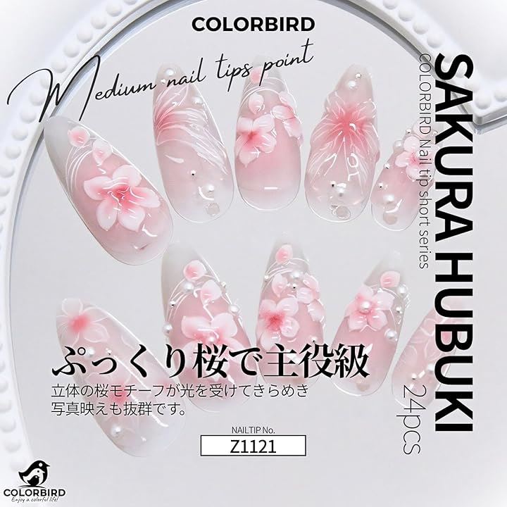 柔らかなピンクのチークネイルに、立体的な桜と繊細なラインアート、上品なパールをあしらったミディアムポイント型のネイルチップ。