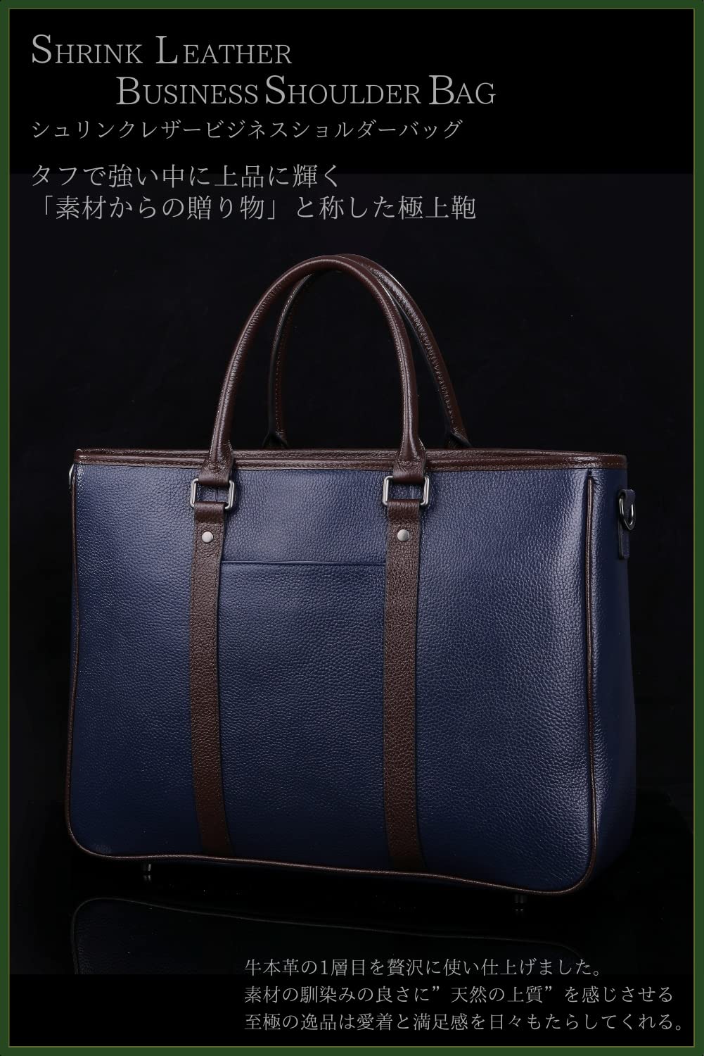 【素材】: 本革 【仕様】: ビジネスバッグ( ショルダーバッグ ) 【対象】 : メンズ 【サイズ】縦幅30㎝×横幅42㎝×マチ12cm×持ち手23㎝ 【重さ】1.4kg 【熟練本革職人が贈る 至高の大人鞄(ショルダーバッグ)】高級シボ牛本革を纏った「BAGPACK」シリーズ。大人の風格漂う逸品に仕上がりました。 【厳選した天然皮革を使用】 本商品は1層目の最表面の牛皮を使用しており、本革特有の不規則で美しい「シボ」(凹凸模様)を愉しんで頂ける商品となっております。 【こだわり収納】 内装には、大中小の小物ポケットとファスナー付きポケットを採用。クッションを施したパソコン専用ポケット付き。広々としたメインポケットは様々な物を収納できます。【素材】: 本革 【仕様】: ビジネスバッグ( ショルダーバッグ ) 【対象】 : メンズ【サイズ】縦幅30㎝×横幅42㎝×マチ12cm×持ち手18㎝ 【重さ】1.4kg【熟練本革職人が贈る 至高の大人鞄(ショルダーバッグ)】高級シボ牛本革を纏った「BAGPACK」シリーズ。大人の風格漂う逸品に仕上がりました。【厳選した天然皮革を使用】 本商品は1層目の最表面の牛皮を使用しており、本革特有の不規則で美しい「シボ」(凹凸模様)を愉しんで頂ける商品となっております。【こだわり収納】 内装には、大中小の小物ポケットとファスナー付きポケットを採用。クッションを施したパソコン専用ポケット付き。広々としたメインポケットは様々な物を収納できます。