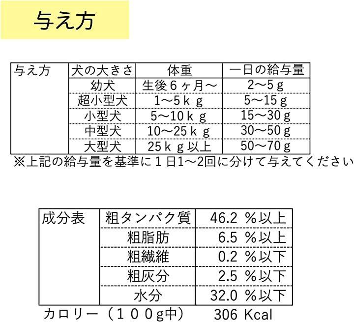 幼犬生後6か月から 2~5g、超小型犬1~5KG 5~15g、小型犬5~10KG 15~30g、中型犬10~25KG 30~50g、大型犬25KG以上 50~70g、給与量を基準に1日1~2回に分けて与えて下さい。