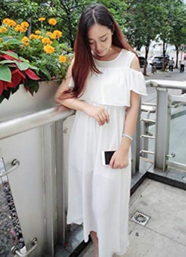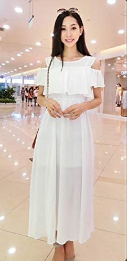 肩出しで、肩やデコルテラインはすっきりと、胸元は生地の重なりでふんわり感がありメリハリのあるシルエットに。