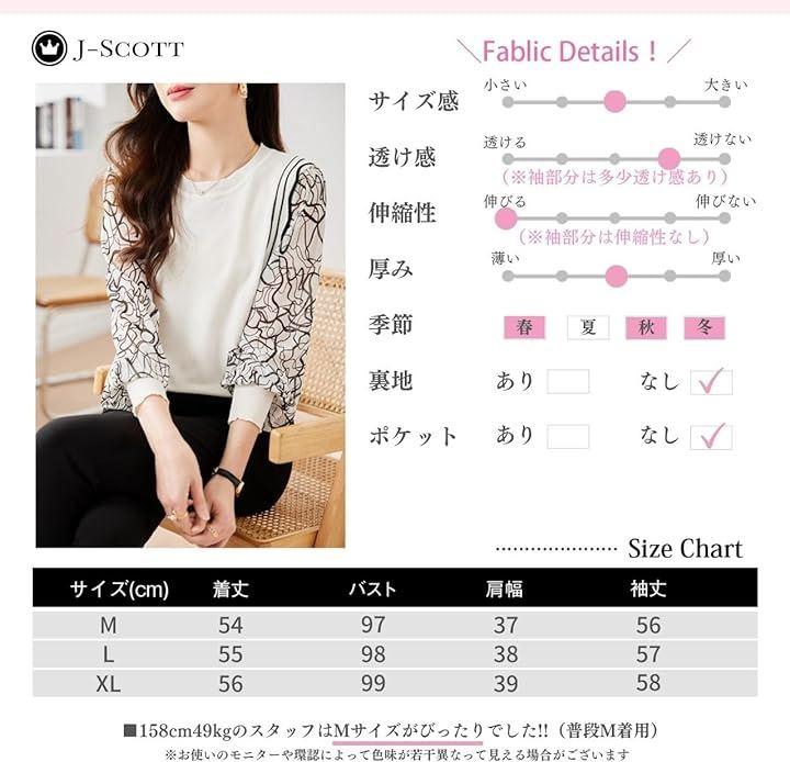 着丈/バスト/肩幅/袖丈 M: 54/97/37/56 L: 55/98/38/57 XL: 56/99/39/58 *158cm/49kgのスタッフの場合:Mがジャストサイズでした(普段M着用)