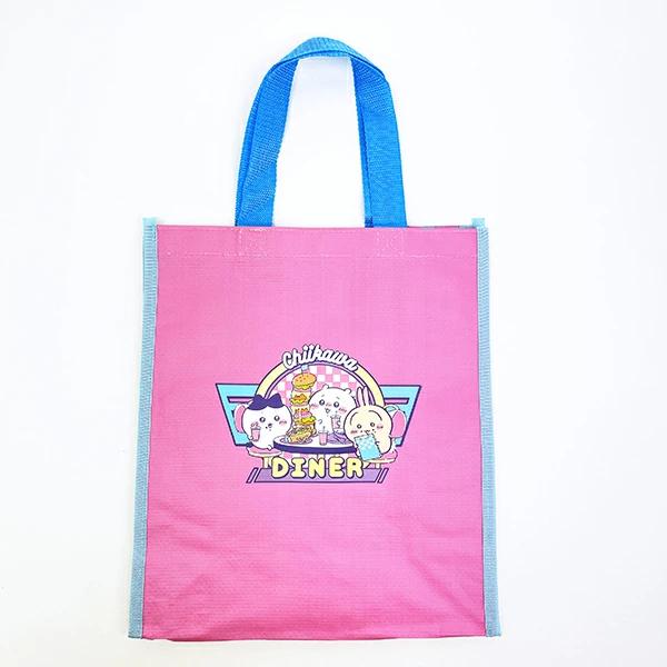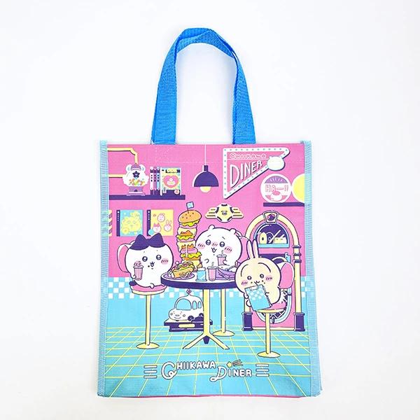 アメリカンダイナーで楽しく食事をするちいかわたちを80年代ポップなカラーリングでアレンジしました!背景の小物にも注目!!レストランの卓上POPをイメージしたPPバッグです。レジャーシートのようなPP素材で軽量なバッグ♪サブバッグとしても◎とっても可愛いデザインなのでぜひ同シリーズのアイテムで揃えてみませんか?