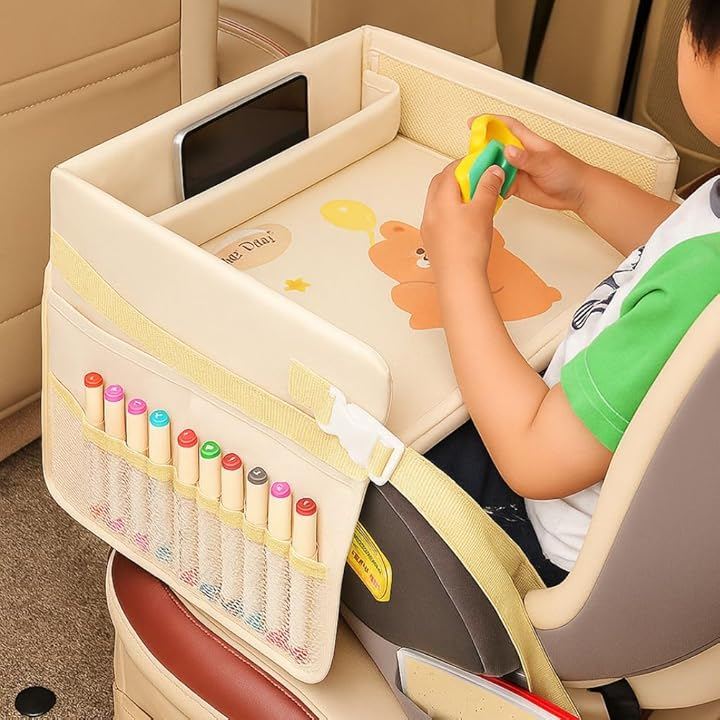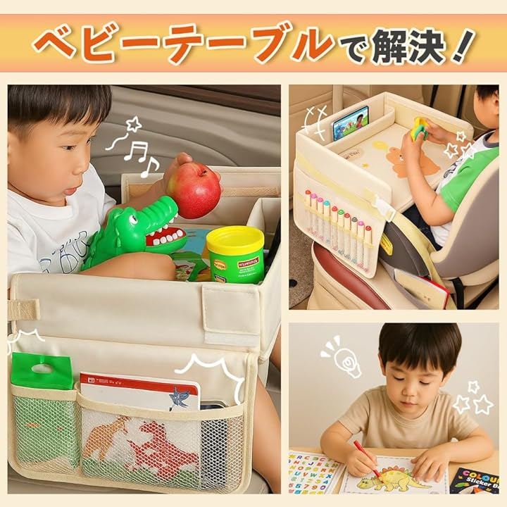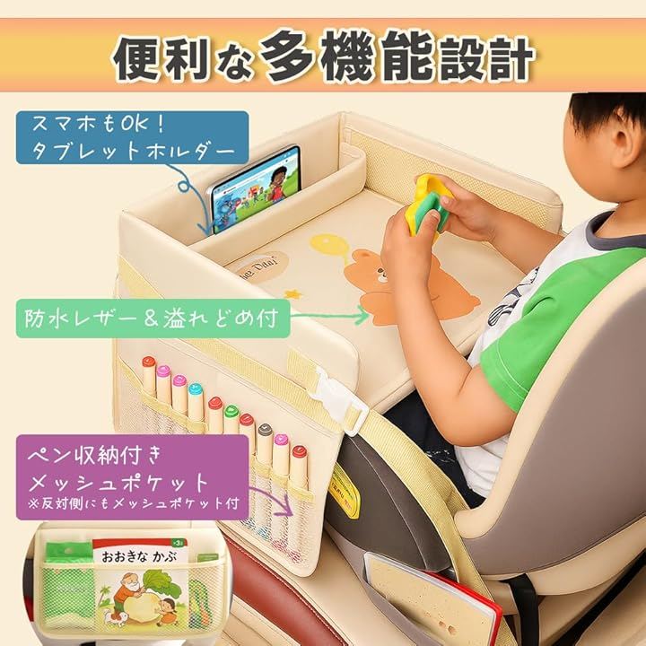 「ドライブ中でも楽しく過ごせるキッズテーブル」チャイルドシートに取り付けるだけで、塗り絵やおもちゃ遊び、タブレット視聴などができる多機能テーブル。