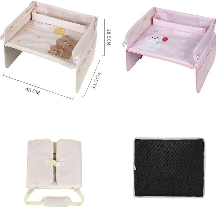 チャイルドシートやベビーカーに取り付けるだけで、お絵描きやおもちゃ遊び、タブレットでの動画視聴ができる多機能テーブルに早変わり。