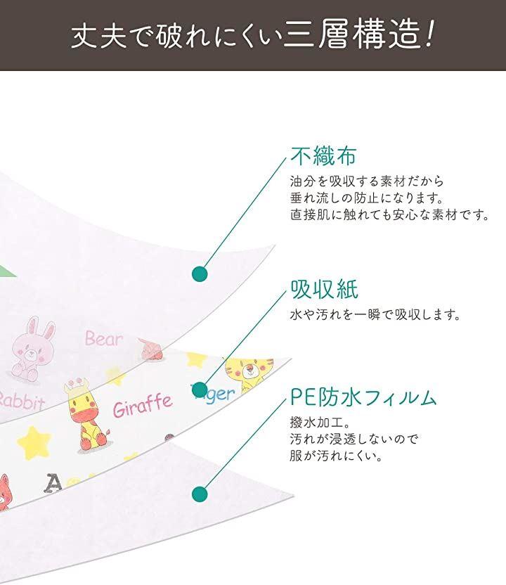 ・裏には防水・漏れ防止の防水フィルムがついていますので、ミルク、お湯や水を飲む時も赤ちゃんの服を濡らす心配がありません。