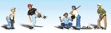草野球をしている少年たちの人形が5体と、バットとグローブと帽子の小物のセットです。