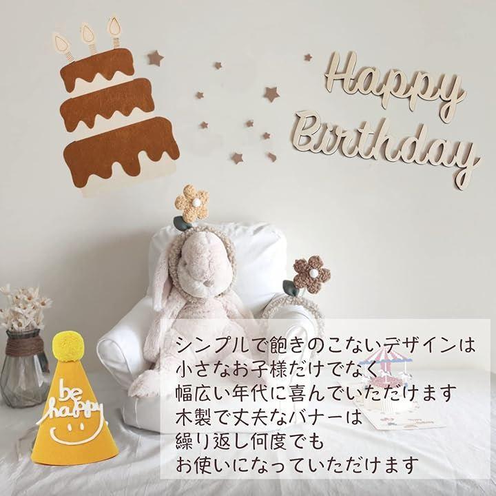 お誕生日の飾り付けにお使いになっていただくシンプルでお洒落な、木製のHappy birthday の文字バナーとデコレーションケーキ・星のデザインバナーと三角帽子のセットです。