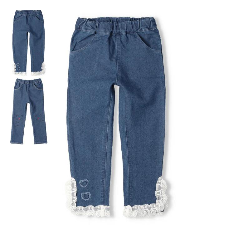 ストレッチ入り生地で動きやすいデニムパンツ、ジーンズ。裾にハートのアップリケと裾レースのデザインと鼻がハートになったネコちゃんの刺繍が入ったデザイン。春のお出かけにもオススメな女の子らしいアイテム。【アイテム】ナチュラル シンプル ベーシック フェミニン ガーリー 無地 カジュアル お洒落 オシャレ かわいい 大人可愛い 普段着 デイリーウェア お出かけ着 お外着 外遊び着 ロング丈 長丈 長ズボン フル丈 ボトムス 子ども こども 女児 女の子 ガールズ キッズ ベビーサイズ トドラーサイズ 幼稚園 保育園 小学校 通園 通学 小学生 2025年春夏物新作 丸高衣料 ネイビー 紺色 ブルー 青色 猫 ねこ 動物 アニマル クレセント