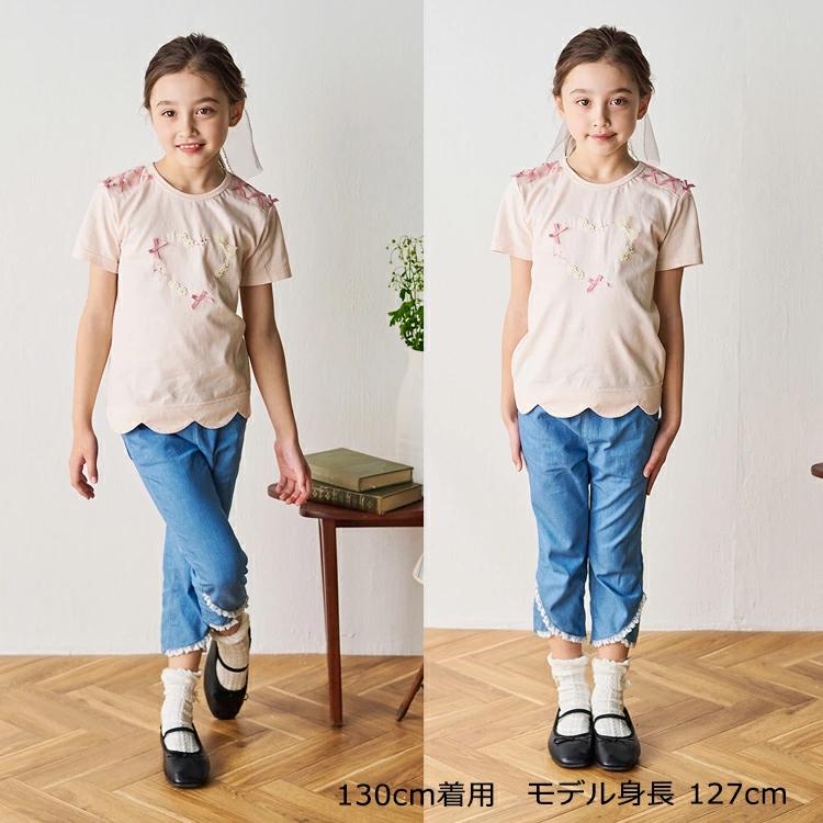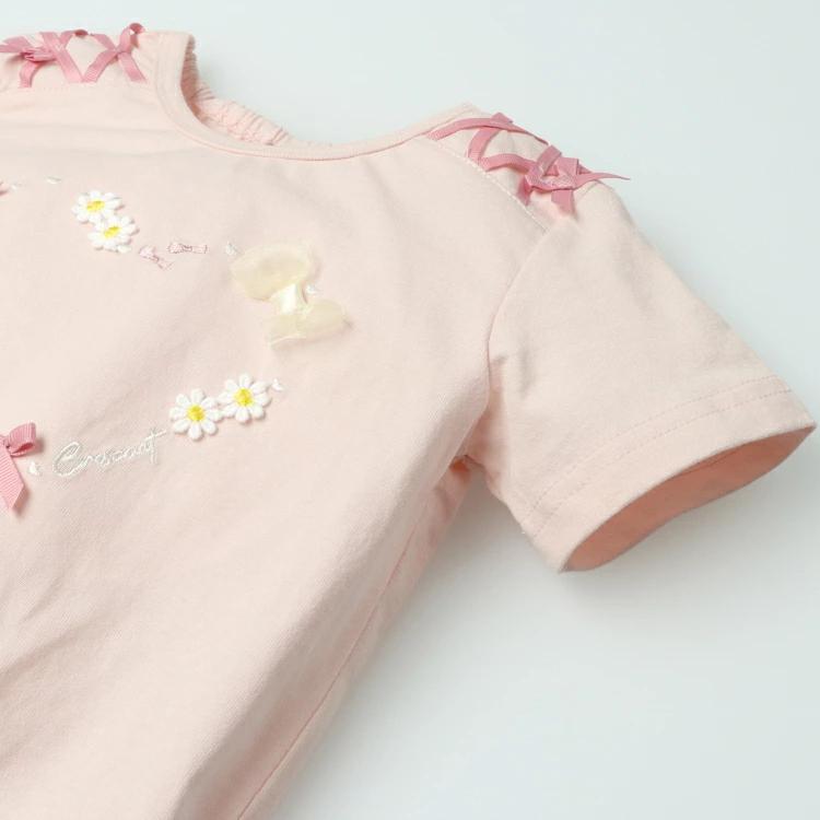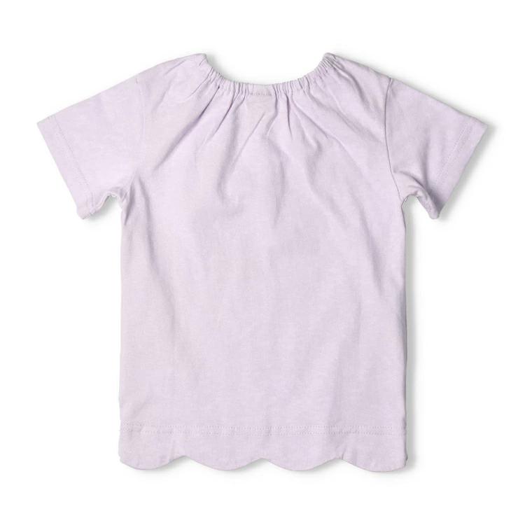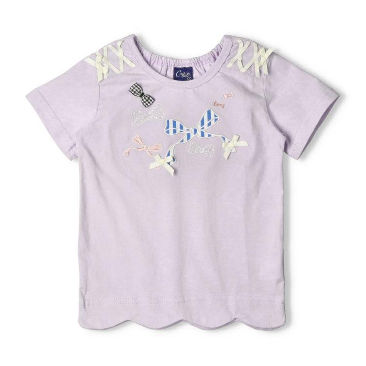 肩のレースアップやリボン使いやリボンのモチーフなどが今っぽいデザイン。裾のスカラップデザインも女の子らしい半袖Tシャツ。襟ぐりの後ろ部分がゴム仕様になっているので、着脱も楽ちんです!【アイテム】トップス シンプル ガーリー フェミニン カジュアル お洒落 オシャレ かわいい 可愛い 普段着 デイリーウェア お出かけ着 お外着 お外遊び着 子ども こども 女児 女の子 ガールズ キッズ ベビーサイズ トドラーサイズ 幼稚園 保育園 小学校 通園 通学 小学生 2025年春夏物新作 丸高衣料 ラベンダー 薄紫色 ピンク クレセント