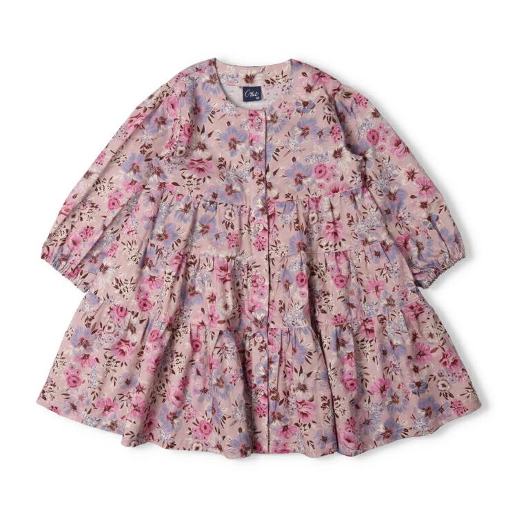 クラシカルなお花柄のフレアーなシルエットが女の子らしいティアードワンピース。前開きデザインなので、ワンピースとして着たり、シャツや羽織としても着用できます。【アイテム】トップス シンプル ガーリー フェミニン カジュアル お洒落 オシャレ かわいい 可愛い 普段着 デイリーウェア お出かけ着 お外着 お外遊び着 子ども こども 女児 女の子 ガールズ キッズ ベビーサイズ トドラーサイズ 幼稚園 保育園 小学校 通園 通学 小学生 2025年春夏物新作 丸高衣料 ロングスリーブ 長袖 フラワー お花 小花 ピンク クレセント コットン100% 綿100%