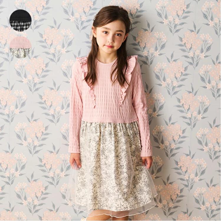 針抜きで模様を表現したパターンメッシュ生地の長袖Tシャツに、チェック・花柄の布帛生地のスカートが切り替えになったワンピース。スカート部分にはチュールがドッキングされていて、お子様らしい可愛らしさを演出します。肩にはフリルが付いており、さらに華やかさをプラス♪首元はゴム仕様なので、簡単に着脱できます。上品なデザインなので、お出かけや特別な日のコーディネートに最適なワンピースです。同じチェックと花柄を使ったTシャツ(N62802)、キュロットパンツ(N63101)、があるので、姉妹やお友達とペア、リンクコーデ、お揃い、おそろいコーディネートも楽しめます!【アイテム】トップス シンプル ガーリー フェミニン カジュアル お洒落 オシャレ かわいい 可愛い 普段着 デイリーウェア お出かけ着 お外着 お外遊び着 子ども こども 女児 女の子 ガールズ キッズ ベビーサイズ トドラーサイズ 幼稚園 保育園 小学校 通園 通学 小学生 2024年秋冬物新作 丸高衣料 ブラック 黒 チェック ピンク 花柄 姉妹 お揃い オソロ おそろい お揃いリンク リンクコーデ ペア シミラールック クレセント