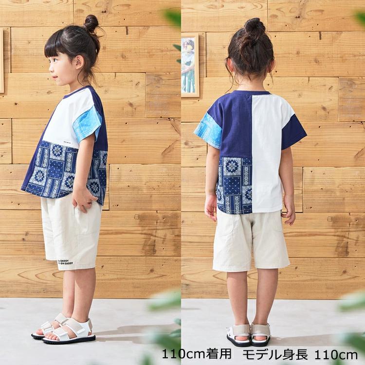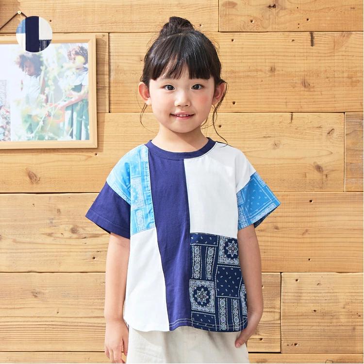 バンダナ柄の切替デザインの半袖Tシャツ。1枚着るだけでインパクトのあるアイテム。男の子も女の子もユニセックスで着られます!同じデザインのスクールサイズ(140,150,160cm)はV34805になります。【アイテム】トップス カジュアル お洒落 オシャレ かっこいい かわいい 可愛い 普段着 デイリーウェア お出かけ着 お外着 お外遊び着 子ども服 こども服 男児 男の子 ボーイズ キッズ ベビーサイズ トドラーサイズ 幼稚園 保育園 小学校 通園 通学 小学生 2025年春夏物新作 丸高衣料 ネイビー 紺色 ダディオダディ 女児 女の子 ガールズ 男女兼用 コットン100% 綿100%