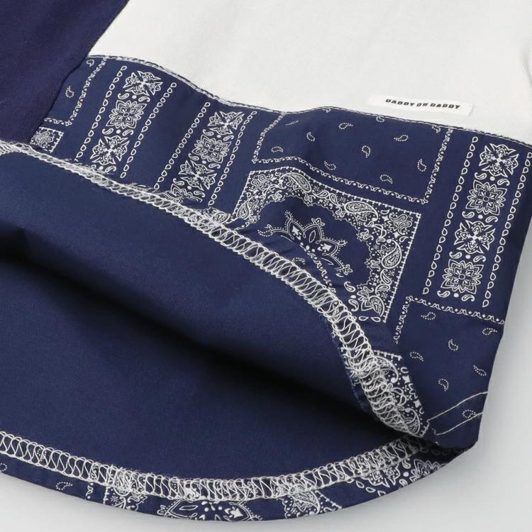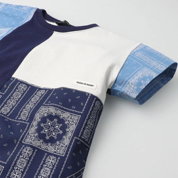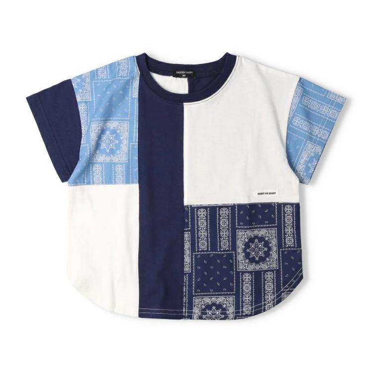 バンダナ柄の切替デザインの半袖Tシャツ。1枚着るだけでインパクトのあるアイテム。男の子も女の子もユニセックスで着られます!同じデザインのスクールサイズ(140,150,160cm)はV34805になります。【アイテム】トップス カジュアル お洒落 オシャレ かっこいい かわいい 可愛い 普段着 デイリーウェア お出かけ着 お外着 お外遊び着 子ども服 こども服 男児 男の子 ボーイズ キッズ ベビーサイズ トドラーサイズ 幼稚園 保育園 小学校 通園 通学 小学生 2025年春夏物新作 丸高衣料 ネイビー 紺色 ダディオダディ 女児 女の子 ガールズ 男女兼用 コットン100% 綿100%