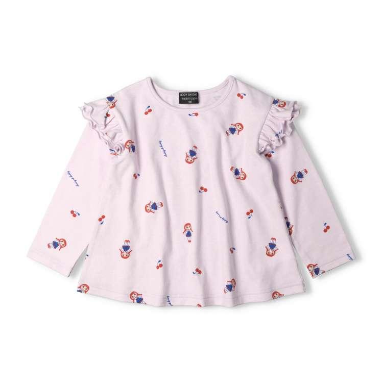 ダディオダディの人気キャラクター「ダディコちゃん」の総柄長袖Tシャツ・ロンTです。【安心の日本製】でギフトやプレゼントにもオススメ!ダディコちゃんとチェリー、ブランドロゴの飛び柄がキュート♪Aラインシルエットに袖のフリルデザインがガーリーで上品な雰囲気です。本体は柔らかくて肌触りの良い天竺(綿)100%生地を使用。季節の変わり目にぴったりなロンTは、デイリーからお出掛けまで幅広く活躍するアイテムです! ☆90cmのみ肩ボタン仕様です。【アイテム】長袖 ロングスリーブ トップス シンプル ガーリー フェミニン カジュアル お洒落 オシャレ かわいい 可愛い 普段着 デイリーウェア お出かけ着 お外着 お外遊び着 子ども こども 女児 女の子 ガールズ キッズ ベビーサイズ トドラーサイズ 幼稚園 保育園 小学校 通園 通学 小学生 2024年秋冬物新作 丸高衣料 オフホワイト 白色 パープル 紫 ラベンダー さくらんぼ サクランボ コットン100% 綿100%