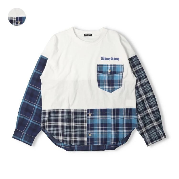 インディゴ風チェックを切り替えた異素材切替デザインの長袖Tシャツ。 チェック柄は柄の違う3種類の生地を使用しています。生地はオーガニックコットンを使用した薄手のガーゼ生地。同じデザインのベビー、トドラーサイズはV14804になります。【アイテム】トップス カジュアル お洒落 オシャレ かっこいい かわいい 可愛い 普段着 デイリーウェア お出かけ着 お外着 お外遊び着 子ども服 こども服 男児 男の子 ボーイズ キッズ ジュニアサイズ スクールサイズ 中学生 中学校 小学校 通園 通学 小学生 2025年春夏物新作 丸高衣料 ロングスリーブ 長袖 オフホワイト 白色 ネイビー 紺色