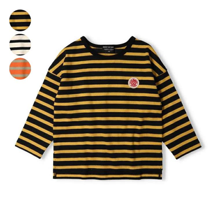 柔らかくて肌触りの良い天竺(綿)100%生地の先染めボーダー長袖Tシャツ・ロンT。【安心の日本製】でギフトやプレゼントにもオススメ!トレンドのオーバーサイズシルエット。着回しのきくボーダーTシャツは、1つあると秋冬コーデに重宝します♪配色がかっこいいブラック×イエロー、ベーシックに使えるオフホワイト×ネイビー、差し色に取り入れたいオレンジ×ベージュの3色展開。胸のブランドロゴワッペンがさり気ないポイントです。カジュアルからお出かけまで幅広く活躍アイテム。同じデザインのスクールサイズ(140,150,160cm)はV52800になります。90cmのみ肩ボタン仕様です。【アイテム】トップス カジュアル お洒落 オシャレ かっこいい かわいい 可愛い 普段着 デイリーウェア お出かけ着 お外着 お外遊び着 子ども服 こども服 男児 男の子 ボーイズ キッズ ベビーサイズ トドラーサイズ 幼稚園 保育園 小学校 通園 通学 小学生 2024年秋冬物新作 丸高衣料 ロングスリーブ 長袖 ロゴプリント コットン100% 綿100% made in Japan メイドインジャパン 国内生産