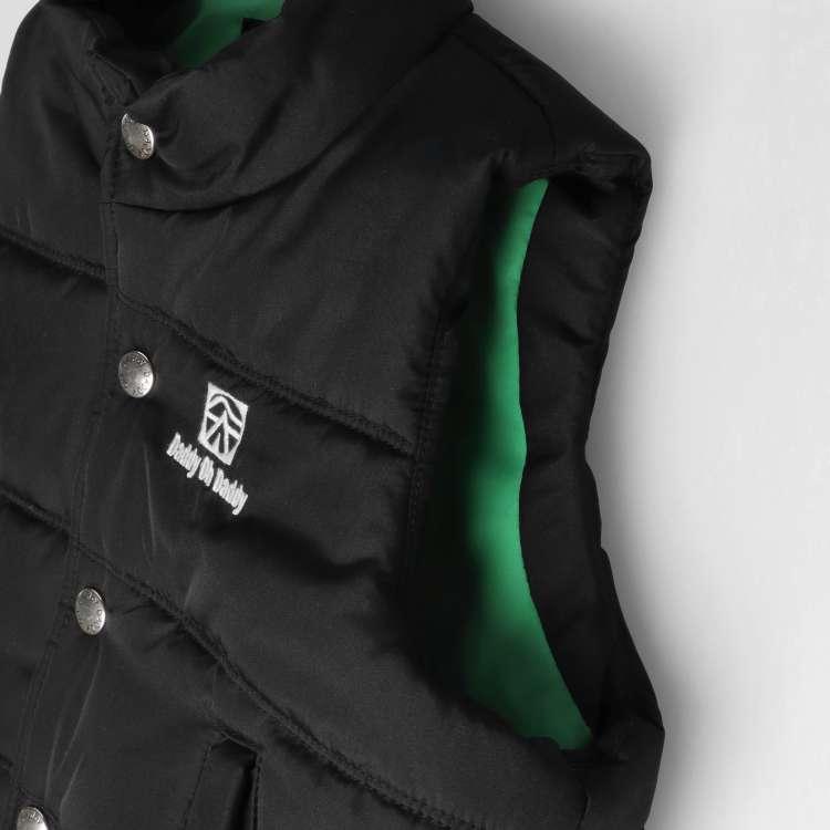 ボリューム感のある中綿入りベスト。 滑らかな手触りで光沢のあるタフタ素材が使用されており、トレンド感のあるスタイルになります。 裏地と表地のカラーが異なり、おしゃれ度の高いアイテムです。 また、胸元のロゴ刺繍がポイントになっています。シンプルなデザインでコーディネートに取り入れやすく、寒暖差の大きい秋から冬にかけて、インナーを変えて長いシーズンお使いいただけます。 裾はゴムで絞ることができるので、体を包み込み風の侵入を防ぎます。同じデザインのスクールサイズ(140,150,160cm)はV52207です。【アイテム】アウター 軽防寒 ライトアウター カジュアル お洒落 オシャレ かっこいい かわいい 可愛い 普段着 デイリーウェア お出かけ 子ども こども 男児 男の子 女児 女の子 ガールズ ボーイズ キッズ ベビーサイズ トドラーサイズ 幼稚園 保育園 小学校 通園 通学 小学生 遠足 旅行 2024年秋冬物新作 丸高衣料 ブラック 黒 ベージュ ダディオダディ