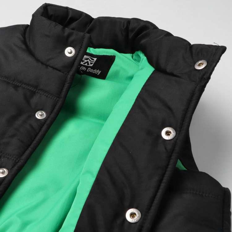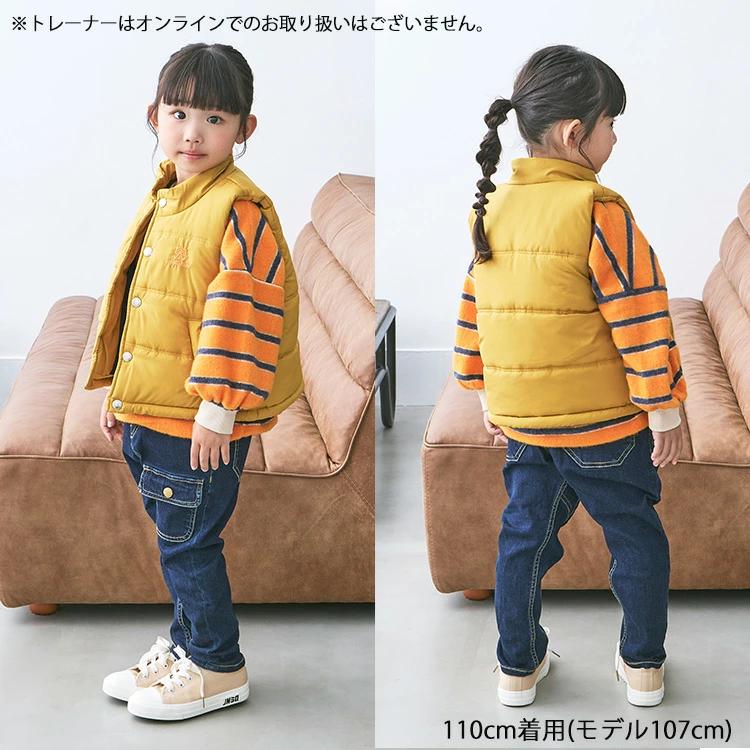 ボリューム感のある中綿入りベスト。 滑らかな手触りで光沢のあるタフタ素材が使用されており、トレンド感のあるスタイルになります。 裏地と表地のカラーが異なり、おしゃれ度の高いアイテムです。 また、胸元のロゴ刺繍がポイントになっています。シンプルなデザインでコーディネートに取り入れやすく、寒暖差の大きい秋から冬にかけて、インナーを変えて長いシーズンお使いいただけます。 裾はゴムで絞ることができるので、体を包み込み風の侵入を防ぎます。同じデザインのスクールサイズ(140,150,160cm)はV52207です。【アイテム】アウター 軽防寒 ライトアウター カジュアル お洒落 オシャレ かっこいい かわいい 可愛い 普段着 デイリーウェア お出かけ 子ども こども 男児 男の子 女児 女の子 ガールズ ボーイズ キッズ ベビーサイズ トドラーサイズ 幼稚園 保育園 小学校 通園 通学 小学生 遠足 旅行 2024年秋冬物新作 丸高衣料 ブラック 黒 ベージュ ダディオダディ