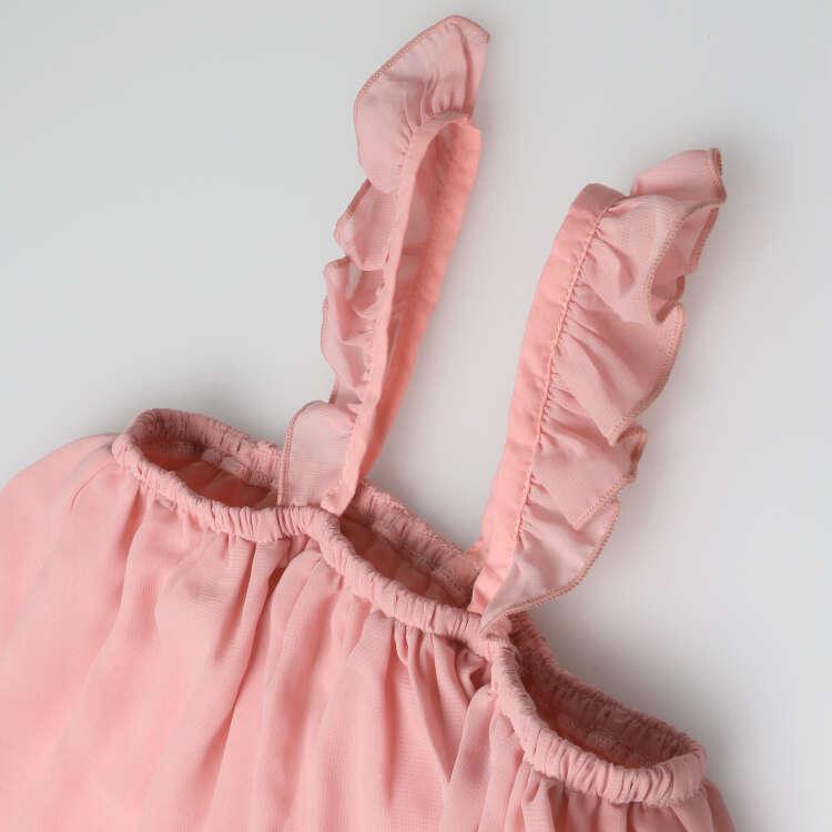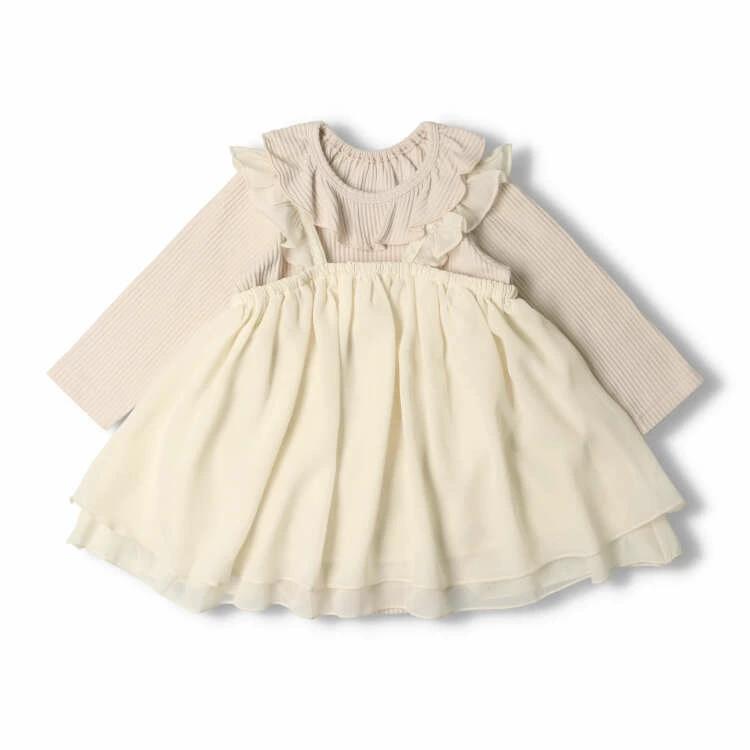 ふんわりシフォンのワンピース。縦縞模様の凹凸感があり、伸縮性、ストレッチ性があって伸びの良いテレコ素材の長袖ボディオール、ロンパース。2点セットです。合わせて切ればお出かけスタイルが完成!お家ではボディオールだけやワンピースも別のTシャツなどと合わせたりと色々と着回しの出来るセットアイテム。ベビーらしさの溢れたデザインがポイント!【アイテム】プレゼント ギフト 赤ちゃん服 ベビー服 贈り物 トップス ボトムス つなぎ カジュアル お洒落 オシャレ かわいい 可愛い 普段着 デイリーウェア お出かけ着 ロンパース トレーナーオール 子ども こども 女児 女の子 ガールズ キッズ ベビーサイズ 幼稚園 保育園 通園 2023年夏物新作 丸高衣料 オフホワイト ベージュ 白色 ピンク キッズズー