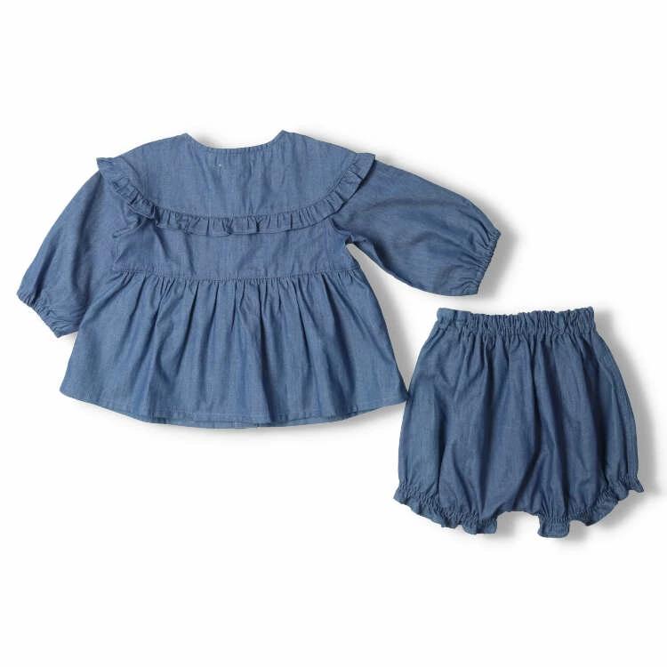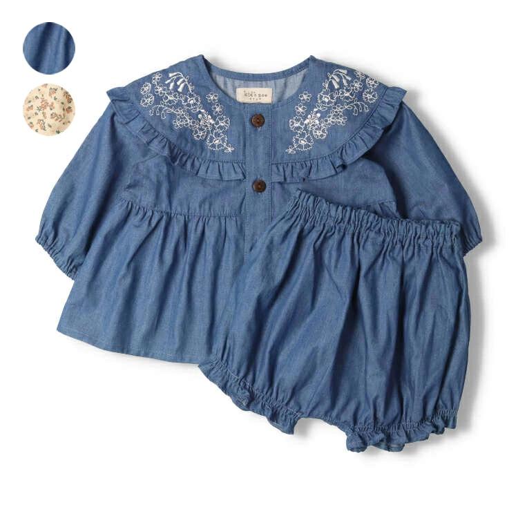 お花の刺繍にフリル使いの前開きデザインのチュニック、チュニックと同じ素材のブルマパンツ、ショートパンツの上下セット。1枚でコーディネートが決まります!上下セットで着ても別々にも着られて、着回しも色々出来るので、ギフトやプレゼントにもオススメ!ライトオンスデニムのブルーと花柄の2色展開。【アイテム】ロングスリーブ 長袖 プレゼント ギフト プルオーバー 赤ちゃん服 ベビー服 贈り物 トップス 無地 シンプル ガーリー カジュアル お洒落 オシャレ かわいい 可愛い 普段着 デイリーウェア お出かけ着 子ども こども 女児 女の子 ガールズ キッズ ベビーサイズ 幼稚園 保育園通園 2023年秋冬物新作 丸高衣料 ハーフパンツ 短パン 半パン ボトムス ショートパンツ ボトム ズボン ブルマ 青色 キナリ 黄色 キッズズー