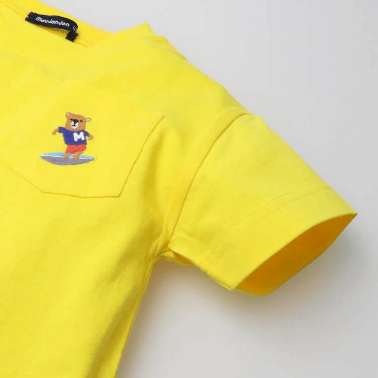 胸のポケットにサーフィンをしているくまの刺繍入り!バックのサーフボードを持ったくまの後ろ姿のプリントも可愛い♪夏らしいデザインの半袖Tシャツ。【アイテム】トップス カジュアル お洒落 オシャレ かっこいい かわいい 可愛い 普段着 デイリーウェア お出かけ着 お外着 お外遊び着 子ども服 こども服 男児 男の子 ボーイズ キッズ ベビーサイズ トドラーサイズ 幼稚園 保育園 小学校 通園 通学 小学生 2024年春夏物新作 丸高衣料 コットン100% 綿100% ホワイト 白色 イエロー 黄色 ムージョンジョン くま 熊 動物 アニマル