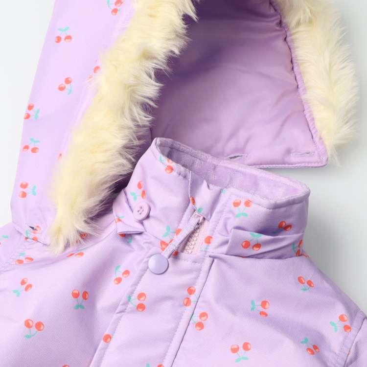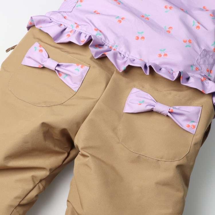 スノーコンビ・ジャンプスーツ・スキーウェアタイプのつなぎ!雪遊びやお外遊びにも!!足部分は二重構造になっているので、ナイロン部分を中に入れてスノーブーツを履いて、スノーブーツの上から被せると足元から雪が入りにくい!ポケットの中のひも、脇部分のひもを調節する事で、手足部分の長さ調節も可能です。お洋服の上から着ることを考えて作られており、大き目の作りなので、ジャストサイズをオススメします。通園、通学の際にもぴったり☆フードはボタンで取り外し可能です!首元衿内側部分はフリース素材で首元も暖か♪表は耐水圧2000mmです!(完全防水ではありません。撥水スプレーとの併用がオススメです。)同じチェリー柄で脚絆、足カバー(M63881)やスノーグローブ、手袋(M63880)もあるので、更なる防寒も可能です!女の子らしいチェリーの総柄と無地の切替デザイン。【アイテム】 カジュアル お洒落 オシャレ かっこいい かわいい 可愛い 普段着 デイリーウェア お出かけ着 ロングスリーブ 長袖 アウター ブルゾン ジャンパー コート ジップアップ フロントジップ 子ども こども 女児 女の子 ガールズ キッズ ベビーサイズ トドラーサイズ 幼稚園 保育園 小学校 通園 通学 小学生 2024年秋冬物新作 丸高衣料 切替 雪遊び スキー スノーボード ソリ遊び ムージョンジョン サクランボ さくらんぼ 果物 フルーツ ハート オフホワイト 白色 ラベンダー パープル 薄紫色