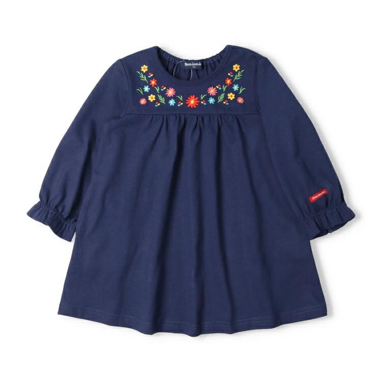 胸に華やかなお花の刺繍入りのシンプルなデザイン。襟ぐりの後ろ部分がゴム仕様になっているので、着脱も楽ちん。天竺、Tシャツ素材でおでかけにもデイリーにもオススメな長袖ワンピース。【アイテム】トップス シンプル ガーリー フェミニン カジュアル お洒落 オシャレ かわいい 可愛い 普段着 デイリーウェア お出かけ着 お外着 お外遊び着 子ども こども 女児 女の子 ガールズ キッズ ベビーサイズ トドラーサイズ 幼稚園 保育園 小学校 通園 通学 小学生 2025年春夏物新作 丸高衣料 ロングスリーブ 長袖 ネイビー 紺色 フラワー お花 ムージョンジョン コットン100% 綿100%