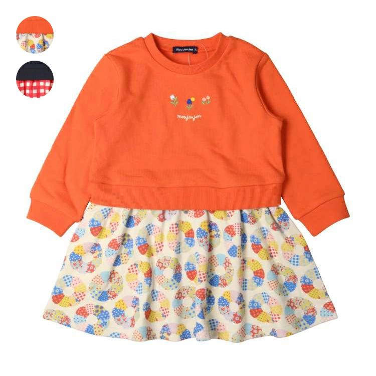 シンプルなお花とブランドロゴの刺繍入りのトレーナーとスカートのドッキングデザインのワンピース。アプリコットのカラーはスカートがアンティークキルト柄、ネイビーはギンガムチェック柄。秋から春まで長く着られる裏毛素材。【アイテム】長袖 ロングスリーブ トップス シンプル ガーリー フェミニン カジュアル お洒落 オシャレ かわいい 可愛い 普段着 デイリーウェア お出かけ着 お外着 お外遊び着 子ども こども 女児 女の子 ガールズ キッズ ベビーサイズ トドラーサイズ 幼稚園 保育園 小学校 通園 通学 小学生 2024年秋冬物新作 丸高衣料 フラワー アプリコット オレンジ コン ネイビー 紺色 ムージョンジョン