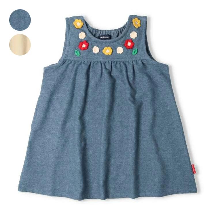 胸元のお花のかぎ針編みモチーフがレトロで可愛らしいジャンパースカート(ジャンスカ)。程よく厚みのある綿100%のネル表起毛素材を使用。 秋はインナーにTシャツやブラウスを合わせて、寒くなってきた冬にはニットやハイネックを合わせて、長いシーズン様々なコーディネートが楽しめる1枚です。首元は後ろがゴム仕様なので、着脱も簡単♪右横に便利なポケット付きです!【アイテム】ナチュラル シンプル ベーシック フェミニン ガーリー 無地 カジュアル お洒落 オシャレ かわいい 大人可愛い 普段着 デイリーウェア お出かけ着 お外着 外遊び着 ボトムス 子ども こども 女児 女の子 ガールズ キッズ ベビーサイズ トドラーサイズ 幼稚園 保育園 小学校 通園 通学 小学生 2024年秋冬物新作 丸高衣料 ネイビー 紺 ベージュ お花 ムージョンジョン コットン100%綿100%