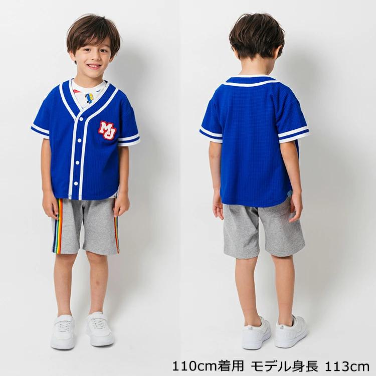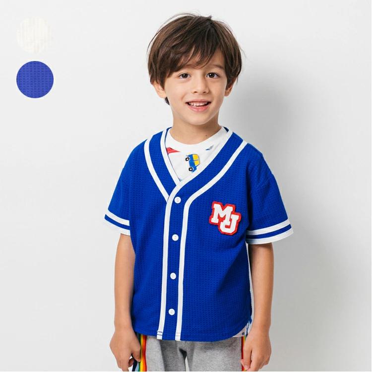 格子柄ジャガードのベースボールシャツ。胸にワッペン付で、スポーティーなイメージ。UVカット加工付で、機能的なアイテム。【アイテム】トップス カジュアル お洒落 オシャレ かっこいい かわいい 可愛い 普段着 デイリーウェア お出かけ着 お外着 お外遊び着 子ども服 こども服 男児 男の子 ボーイズ キッズ ベビーサイズ トドラーサイズ 幼稚園 保育園 小学校 通園 通学 小学生 2025年春夏物新作 丸高衣料 ブルー 青色 ホワイト 白色 ムージョンジョン