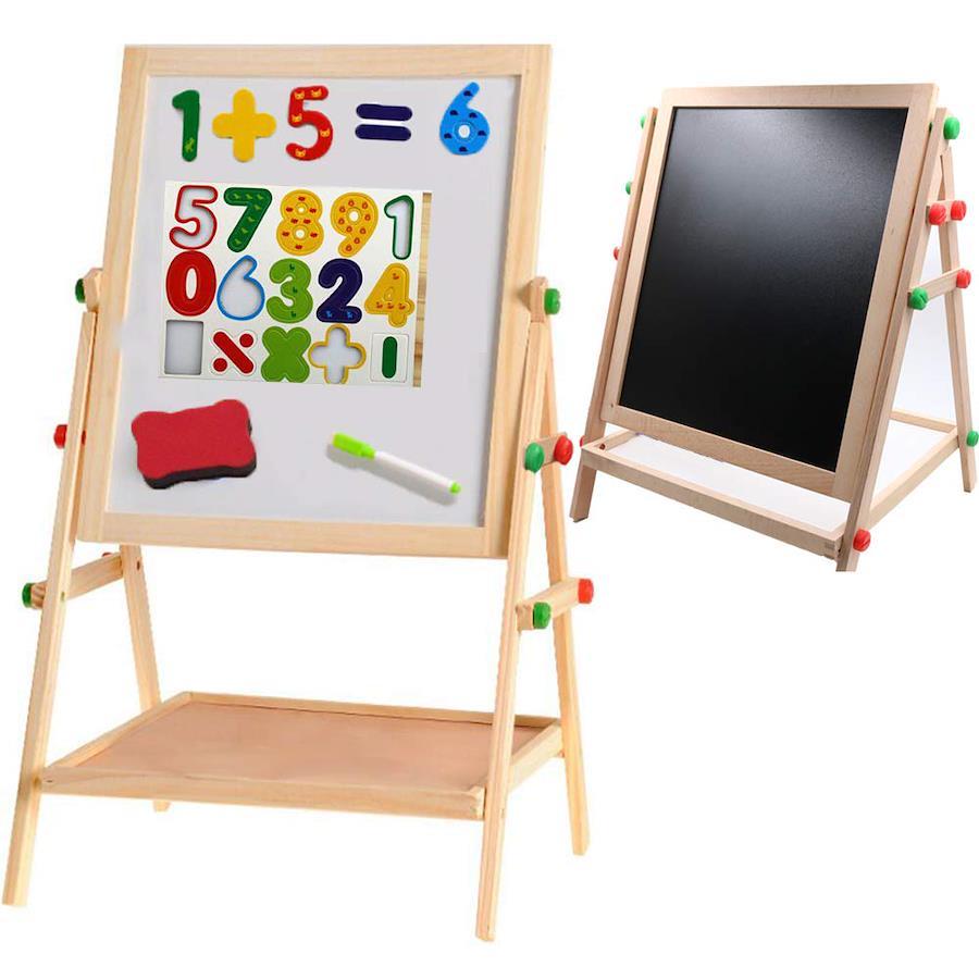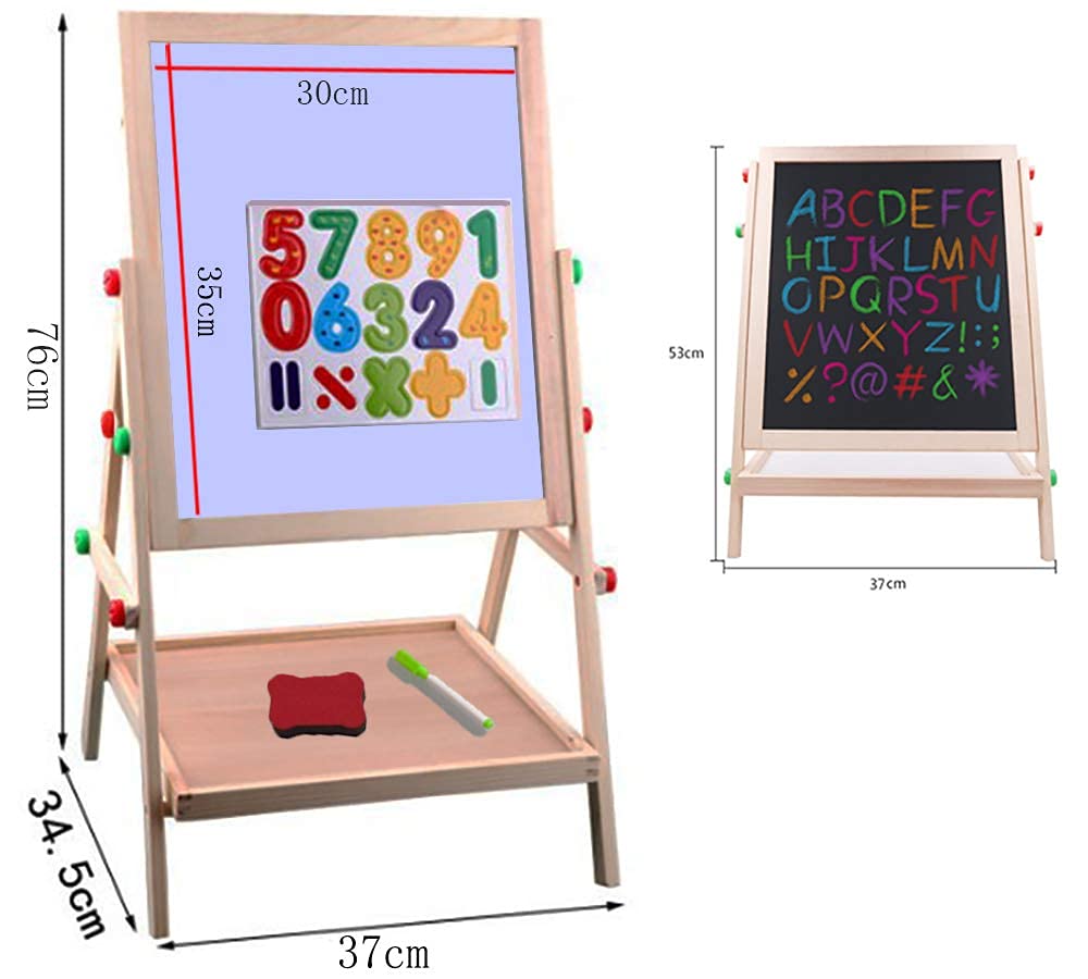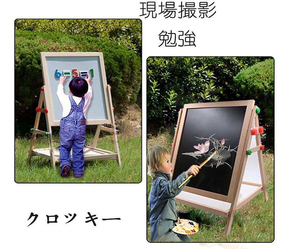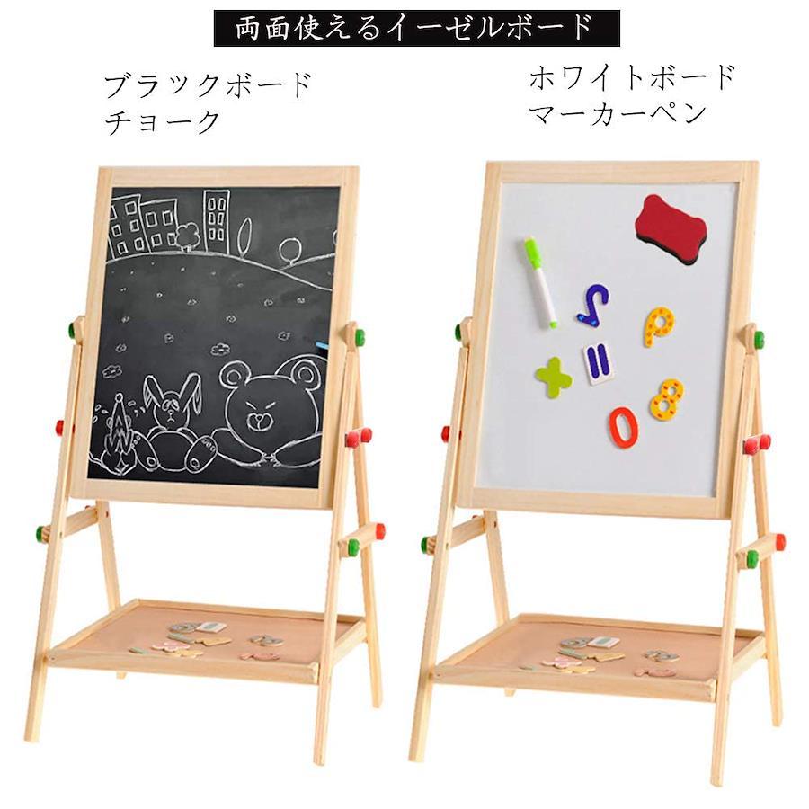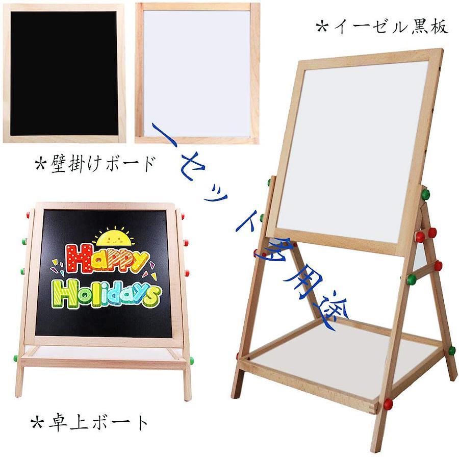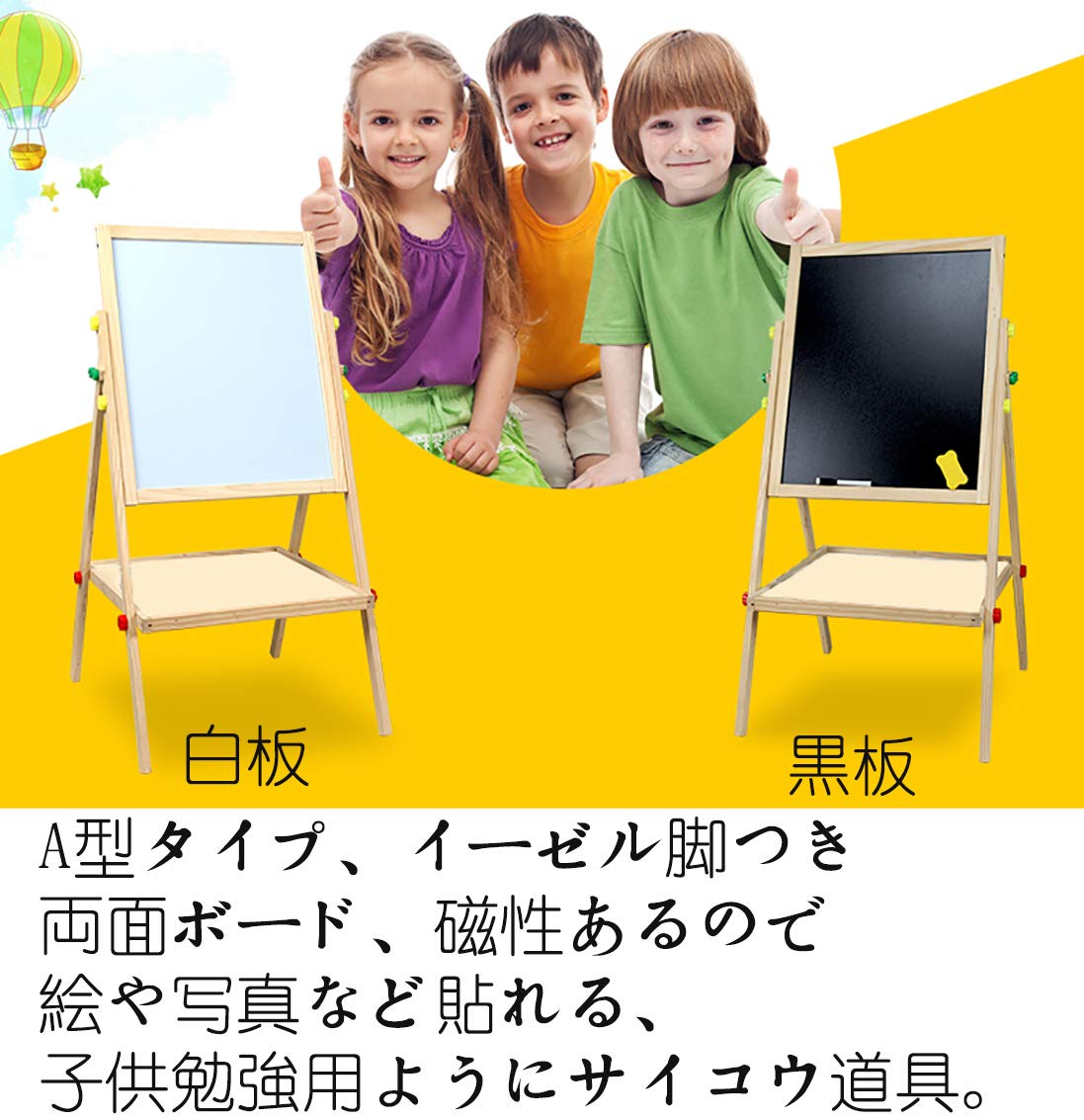 黒板 ボードの仕様:ブラックとホワイト書きボードのサイズは35㎝*30cm、重さ:1.65KG、イーゼルこみ黒板の長さは50cmから75cmまで調整できます。ホワイトボード・黒板はインクやチョークを使ってお絵かきするので、小ささの子供や少し大きな子どもにも使えます。ご注意:インクやチョークを使うため、小さな子どもは口に入れてしまったり、お部屋を汚してしまったりする場合があるので要注意。 イーゼル黒板のメリットは、なんといってもペンやチョークの色が豊富で、カラフルな絵が描けること。専用のイレーサーが付属しているので、簡単に消すこともできます。またマグネットが使える商品が多く、文字の勉強や形合わせなど、遊び方が豊富なのも魅力です。3歳以上の子どもに使わせたい方や、画家巨匠ごっこをしたい子どもにぴったりです。また、マグネットを貼り付けて遊ぶならもう少し低年齢の子どもにも良いでしょう。 木製イーゼ ルボード:木のぬくもりを感じられる、ナチュラルデザインが魅力 イーゼルつきで絵描きさん気分を味わえる。イーゼルつきで、まるで絵描きさんのような気分を楽しめます。3段階の高さ調整が可能なので、成長に合わせて長く使えるでしょう。お絵かきだけでなく、マグネットを貼り付けても遊べます マグネットがくっつくキッズホワイトイーゼル タイプです、高さ調節ができるほか両面使用することも可能、兄弟で一緒に使えるものが欲しい人や、お絵かきグッズをまとめて収納しておきたい人は、候補に入れてみてはいかがでしょうか。黒板やホワイトボードに描く先生に憧れる子も多いので、自分専用のものがあるとワクワクするでしょう。 注意事項:①勝手に使えるイーゼルの高さ調節できる両面書ける落書きボードです,白板に水性マジックで、黒板にチョークでお使いください。②頑固なペンあとが残ってしまう場合は、普通の洗剤を雑巾やティッシュに含ませて消せば何の問題も無くピカピカになります。③ホワイトボードに保護フィルムが貼ってありますがご利用する前に必ずお剥がしください。 ○○★★模倣品をご注意くださいませ、弊社Hema Art をご確認ください。安すぎる商品は品質のほうは保証しませんから。
