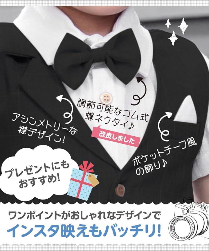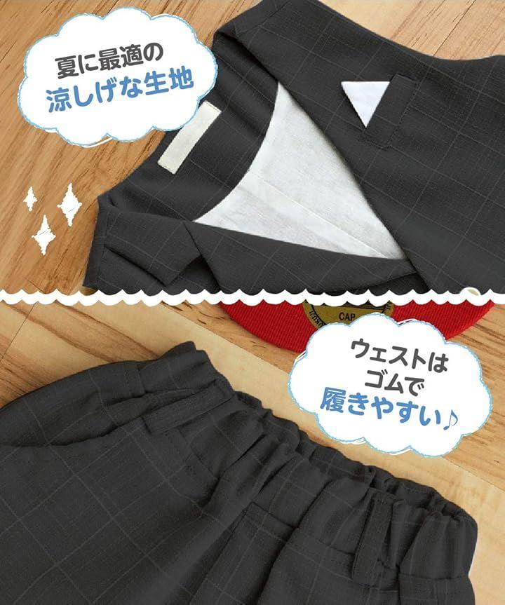 「上品で爽やか」夏用スーツスタイルの子ども服で、チェック柄のハーフパンツ&ベストが映えるデザイン。