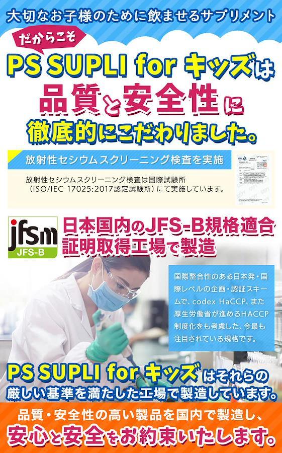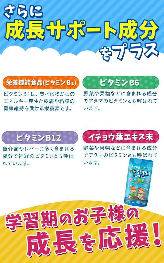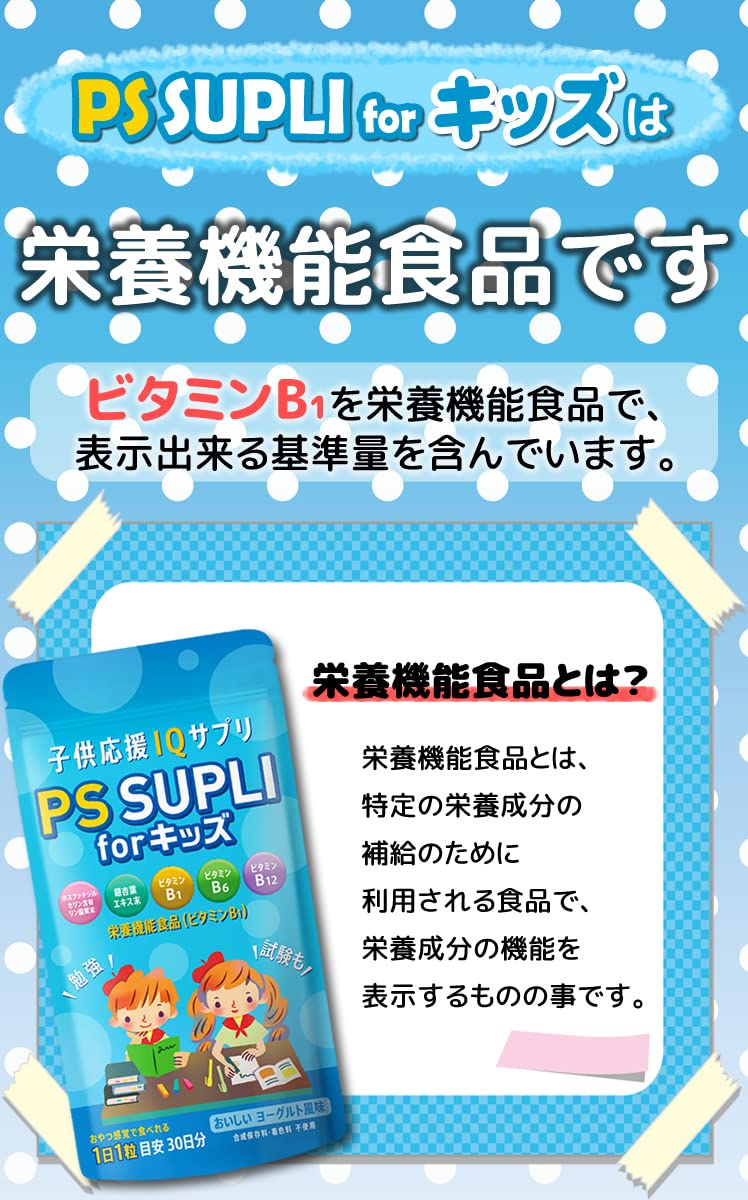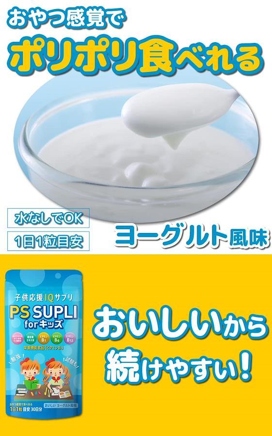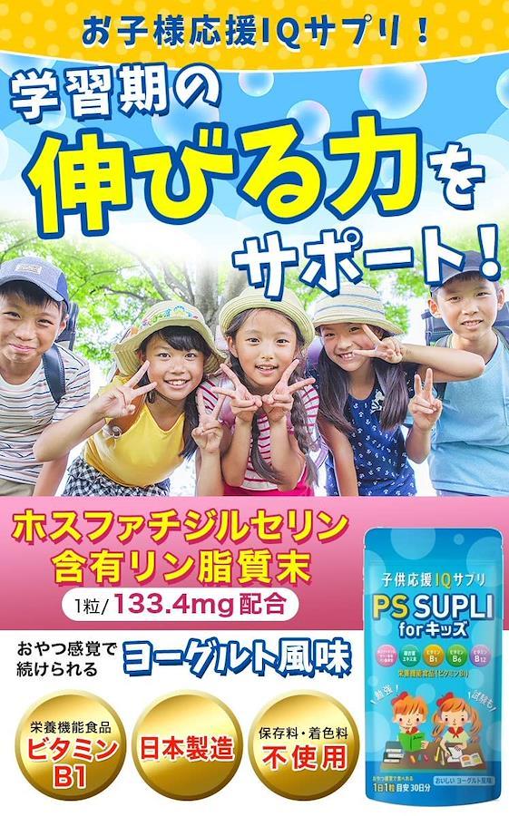 ■サイズ:??19x10x2cm;50g ?【ホスファチジルセリン含有】PS SUPLI forキッズは1粒に133.4mgのホスファチジルセリン含有脂質末を含有したサプリです食べやすいヨーグルト風味のチュアブルタイプだからお子様でもお菓子感覚ではじめられて大人の方もお召し上がり頂けるサプリメントです ?【サポート成分をプラス】イチョウ葉エキス末、ビタミンB1、ビタミンB6、ビタミン12を追加配合 栄養機能食品(ビタミンB1) ?【日本製造】日本国内のJFS-Bk規格適合証明取得工場で製造された製品です 大切なお子様のために、放射性セシウムスクリーニング検査を実施しています ?【原材料】ブドウ糖、デンプン分解物、ホスファチジルセリン含有リン脂質末(ホスファチジルセリン含有リン脂質(大豆含む)、イソマルト)、酵母、デキストリン、乳糖を主原料とする食品、銀杏葉エキス末、ショ糖脂肪酸エステル、セルロース、クエン酸、香料、甘味料(ステビア)、ビタミンB1、ビタミンB6、甘味料(甘草)、二酸化ケイ素、L-テアニン、ビタミンB12 ?【内容量】1袋30粒入り(30日分)、1日1粒あたり目安に噛んでお召し上がり下さい ■重要なお知らせ原材料・成分ブドウ糖、デンプン分解物、ホスファチジルセリン含有リン脂質末(ホスファチジルセリン含有リン脂質(大豆含む)、イソマルト)、酵母、デキストリン、乳糖を主原料とする食品、銀杏葉エキス末、ショ糖脂肪酸エステル、セルロース、クエン酸、香料、甘味料(ステビア)、ビタミンB1、ビタミンB6、甘味料(甘草)、二酸化ケイ素、L-テアニン、ビタミンB12