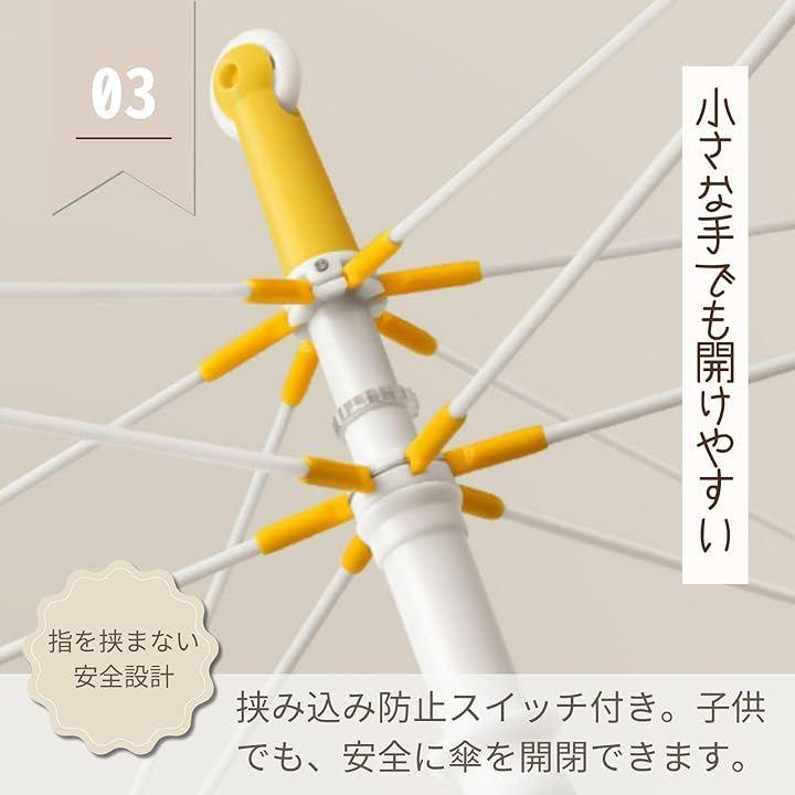 「指を挟まない安全設計」挟み込み防止スイッチが付いているため、小さな子どもでも指を挟む心配が少なく、安全に傘を開閉できます。