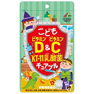 そのままかんで食べられる、ぶどう風味のビタミンD、ビタミンC、KT-11乳酸菌チュアブルタブレットです。お子様をはじめ大人の方もお召し上がりいただけます。1日2粒で、ビタミンD5.5?、ビタミンC100mg、KT-11乳酸菌2億個が摂取できます。