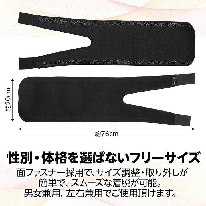 「製品仕様」「製品仕様」片足用(左右兼用)1個入り [外形寸法] 幅:約76cm, 奥行:約20cm,高さ:約0.4cm [適応サイズ] 太もも回り:約70cm以下(テープで調整可能) [重量] 約150g [付属品] 収納袋(幅:約28cm, 奥行:約19cm)
