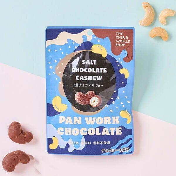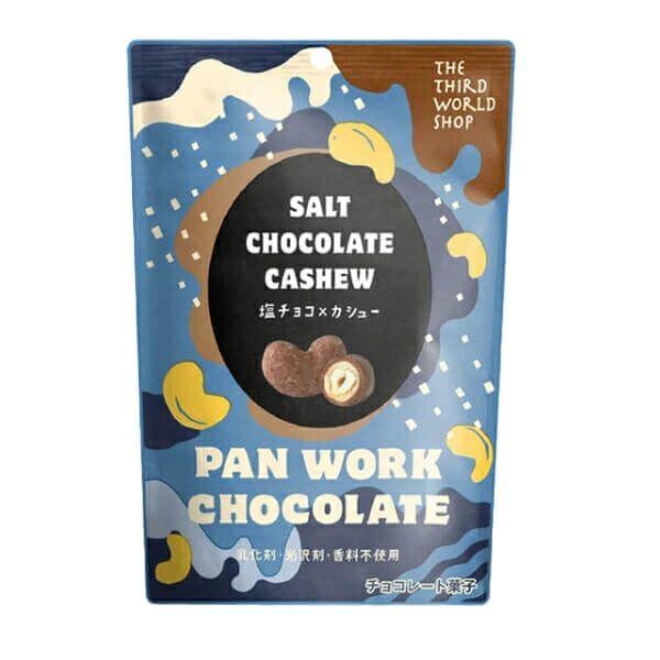 第3世界ショップ塩チョコ×カシューは、サクサクの衣で包んだカシューナッツを、塩入りのミルククーベルチュールチョコレートでコーティング食べやすい粒タイプ