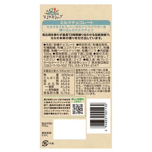 第3世界ショップミルクチョコレートは、カカオ分38%の豊かなミルクの風味とコクの定番チョコレートです。