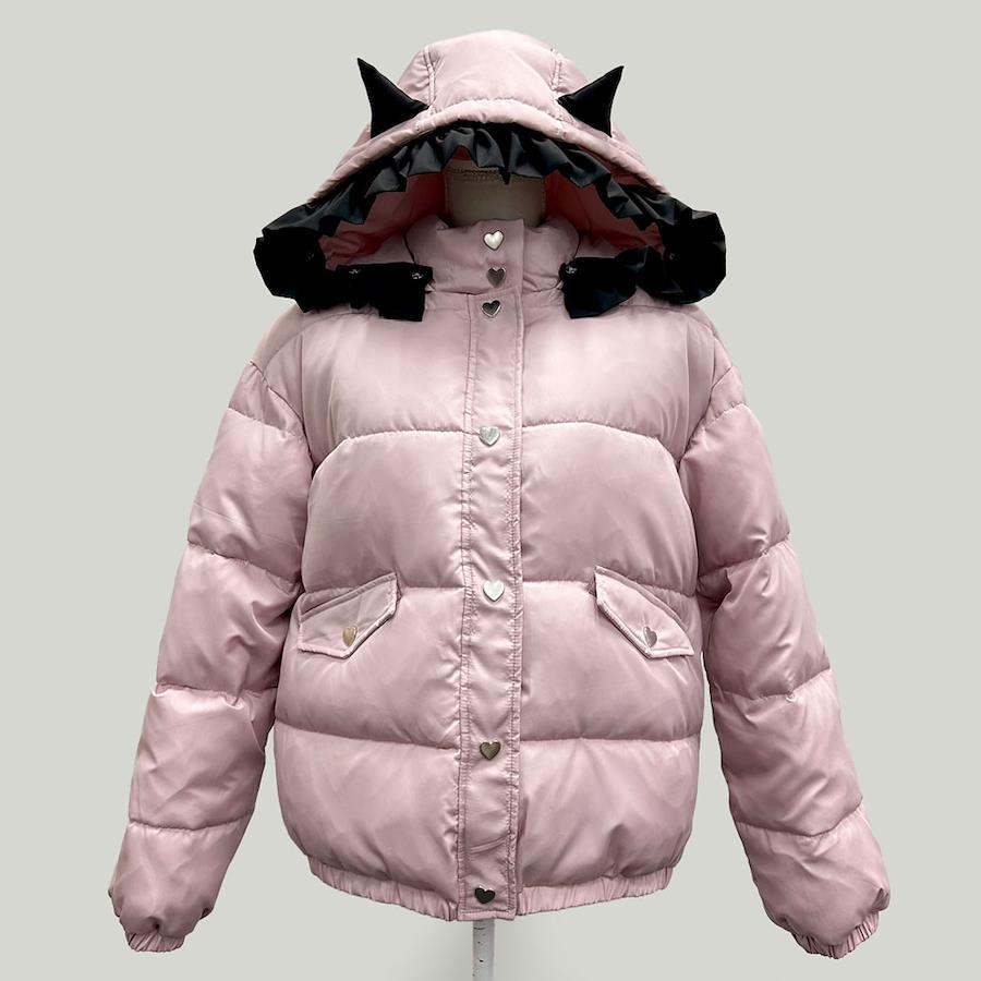 カラバリたっぷり、選べるフードデザインのかわいすぎるダウンコートが登場♪【デザイン】DearMyLoveからダウンコートが登場♪ツノ付きとフリルフードの選べるデザインになっています♪フードを被ると映えること間違いなしのでデザインです。フードフリルはボタンで取り外し可能なのでお好みのスタイルで着用してください。さりげないハートスタッズもかわいく、普段使いにぴったりのアイテム。これからの寒い時期にかわいいダウンコートいかがでしょうか?【素材】中綿入りのダウンコートです。しっかりと暖かいです。ポケット付き。スナップボタンとジップファスナーで開閉可能です。【コーディネート】量産コーデから地雷コーデまで幅広いコーデに活躍してくれるアイテムです。これから寒くなる季節に1枚あると便利なかわいいダウンコートです♪ミニスカートコーデから、ワンピースコーデまで幅広く合わせやすいです。《透け感》なし 《生地の厚さ》厚手 《裏地》あり 《伸縮性》なし《生産国》中国