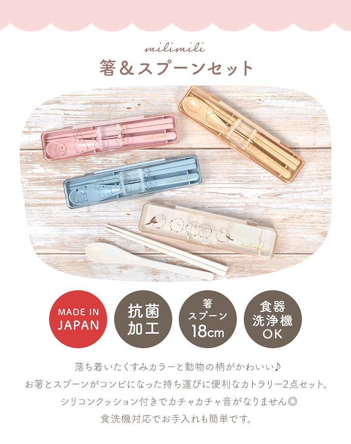 【抗菌箸&スプーンセット】お箸とスプーンがケースに入った便利なカトラリー2点セット。ケースにシリコンクッションが付いているので持ち歩く時に気になる「カチャカチャ」音が鳴りません◎食洗機使用OKなのでお手入れもラクラク!同じ柄でランチグッズを揃えるのもおすすめです♪