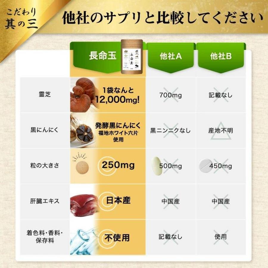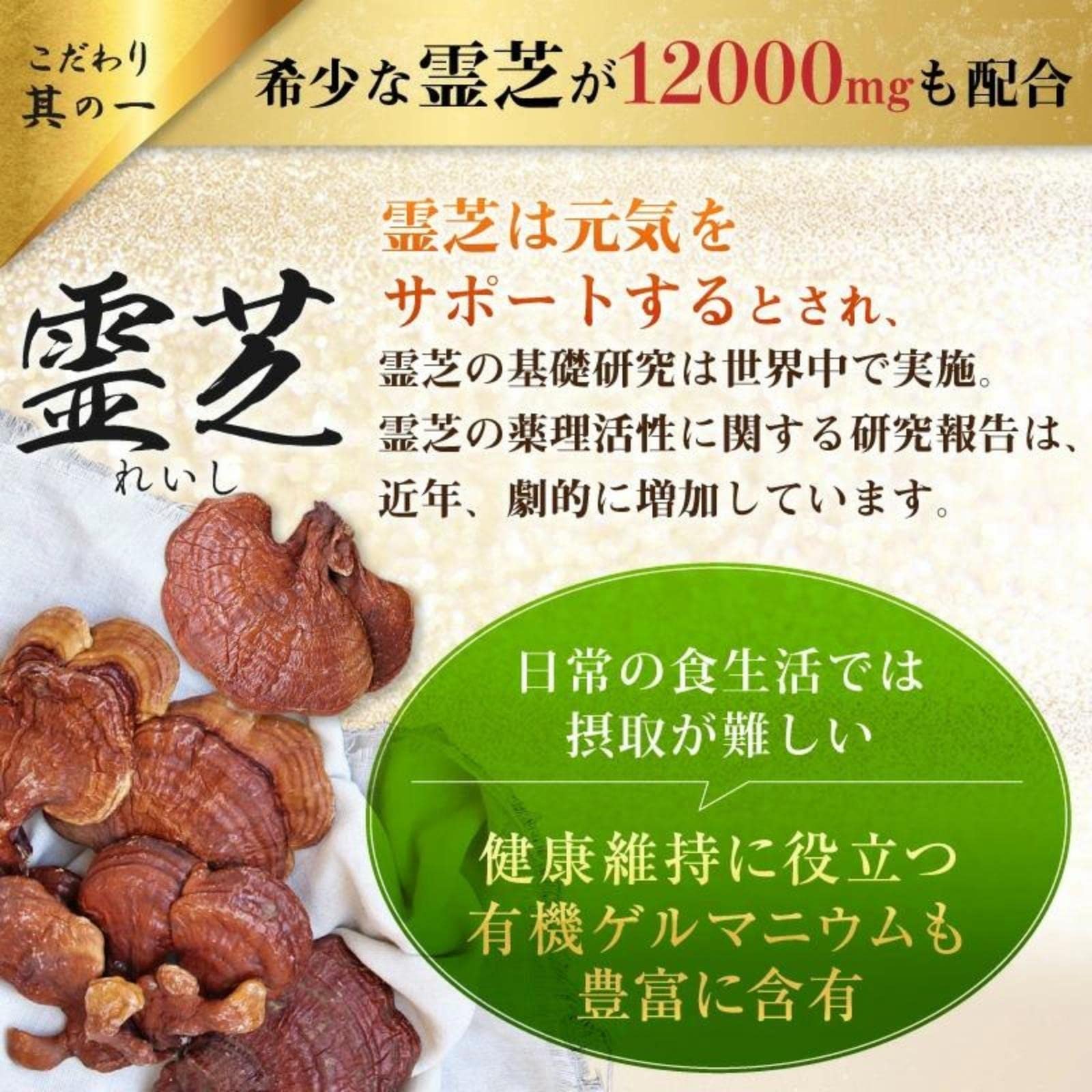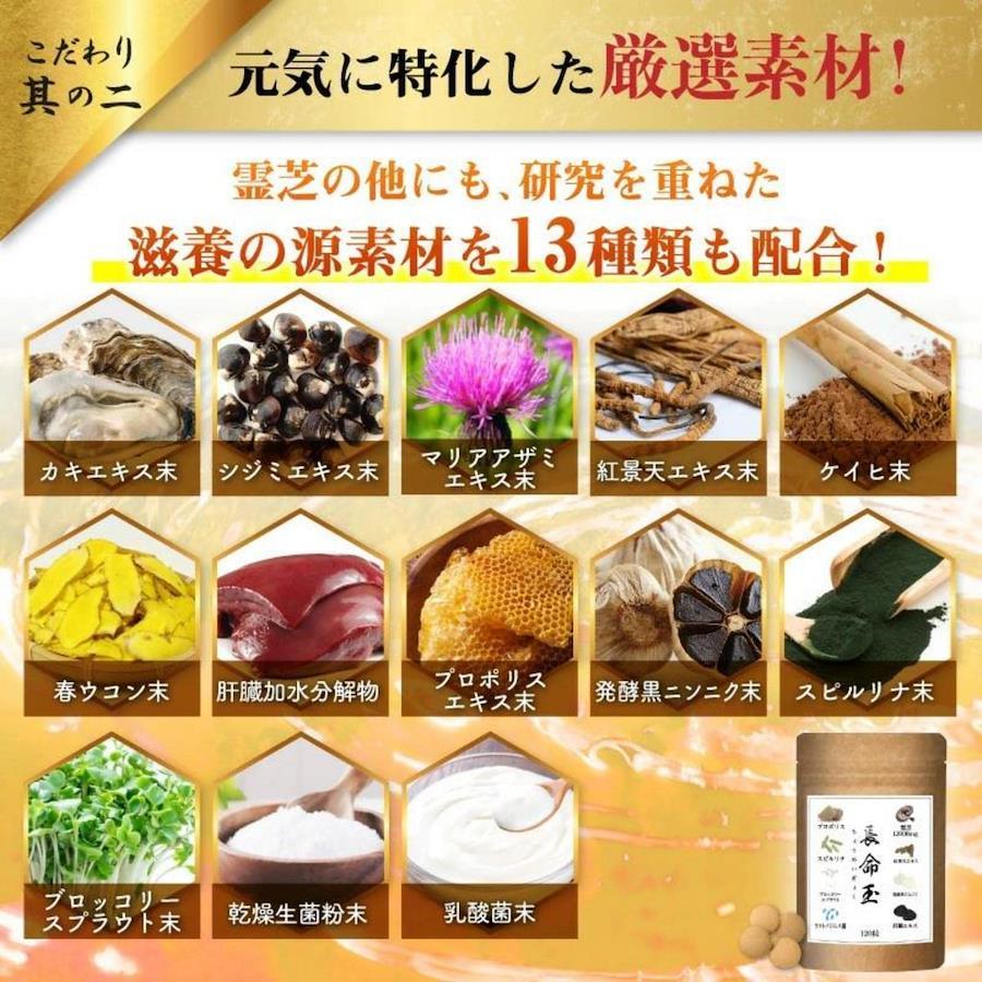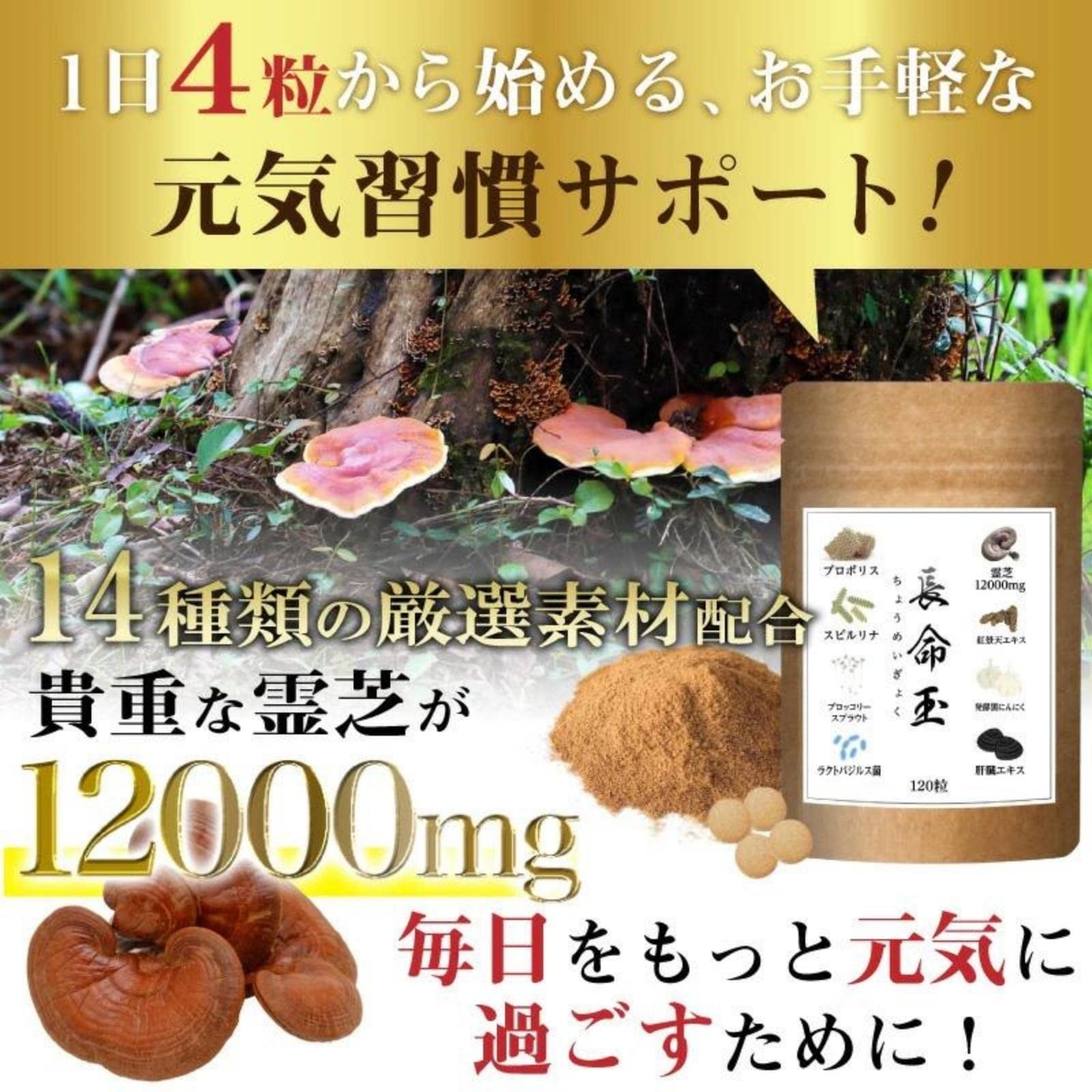 ■サイズ:??16.8x10.8x1.5cm;30g 【1日4粒から始めるお手軽習慣サポート!長命玉】元気力を高めることで有名な「B-dグルカン」を始めとして、「トリテルペン」「アミノ酸」「カルシウム」「ミネラル」を豊富に含んだ「霊芝」を12000㎎配合しており、お手軽に摂取することができます。 【スーパーフード「スピルリナ」配合】タンパク質・脂質・糖質・食物繊維・ビタミン・ミネラル・色素・核酸・SOD酵素といった野菜・魚・肉・乳製品の栄養素がスピルリナには豊富に含まれております。 【霊芝の他にも13種類の素材厳選配合】「カキエキス末」「シジミエキス末」「マリアアザミエキス末」「紅景天エキス末」「ケイヒ末」「春ウコン末」「肝臓加水分解物」「プロポリスエキス末」「発酵黒ニンニク末」「スピルリナ末」「ブロッコリースプラウト末」「乾燥生菌粉末」「乳酸菌末」、霊芝の他にも研究を重ねた13種類の素材を配合しております。 【国内製造(日本製)】高品質で安全な商品をお届けするために、GMP認定の国内工場で製造し、品質管理も1つ1つ徹底的に行っております。なお、「保存料」「着色料」「香料」も一切使用しておりません。【使用方法】1日4粒を目安に朝晩に、水などでお召し上がりください。 【原材料】霊芝粉末、還元麦芽糖水飴、カキエキス末、シジミエキス末、マリアアザミエキス末、紅景天エキス末、ケイヒ末、春ウコン末、肝臓加水分解物、プロポリスエキス末、発酵黒ニンニク末、スピルリナ末、ブロッコリースプラウト末、乾燥生菌粉末、乳酸菌末/セルロース、V.C、ステアリン酸Ca、微粒酸化ケイ素、HPC、L-グルタミン、コハク酸 ■重要なお知らせ原材料・成分【原材料】霊芝粉末、還元麦芽糖水飴、カキエキス末、シジミエキス末、マリアアザミエキス末、紅景天エキス末、ケイヒ末、春ウコン末、肝臓加水分解物、プロポリスエキス末、発酵黒ニンニク末、スピルリナ末、ブロッコリースプラウト末、乾燥生菌粉末、乳酸菌末/セルロース、V.C、ステアリン酸Ca、微粒酸化ケイ素、HPC、L-グルタミン、コハク酸使用方法【お召し上がり方】1日4粒を目安に、水などでお召し上がりください。ご注意(免責)> 必ずお読み下さい開封後はお早めにお召し上がりください。 製造時期によりパッケージの色などが多少異なる場合がありますが、品質に変更はありませんので、?ご安心ください。